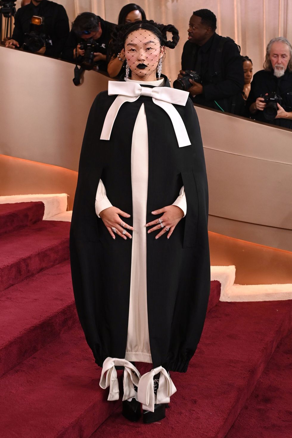 Singer and rapper Audrey Nuna, most recently known for her work on "KPop Demon Hunters," wore a look by Thom Browne from the fall 204 collection. The black and white look featured oversized bows and a cape. The look was accessorized with a sheer face covering, dangly earrings, and sculptural braided hair.