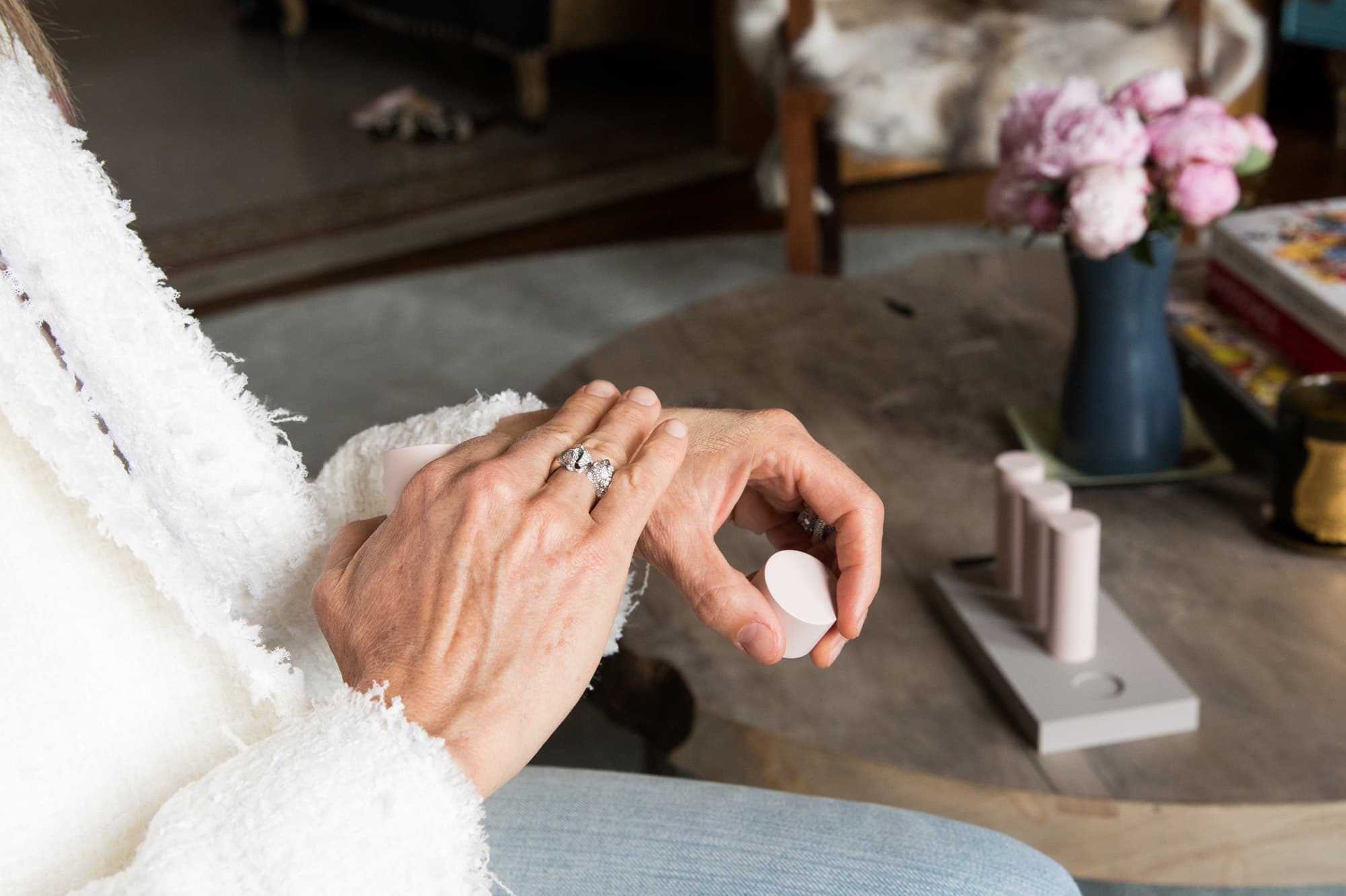 lighting. Lit Cire Trudon candles are scattered in every room, and her Céline crossbody and white quilted CHANEL wallet sit on a leather-top desk overlooking an expansive view of the park. As we walk into her front door, homemade almond milk buzzes in the Vitamix in her kitchen, and her signature