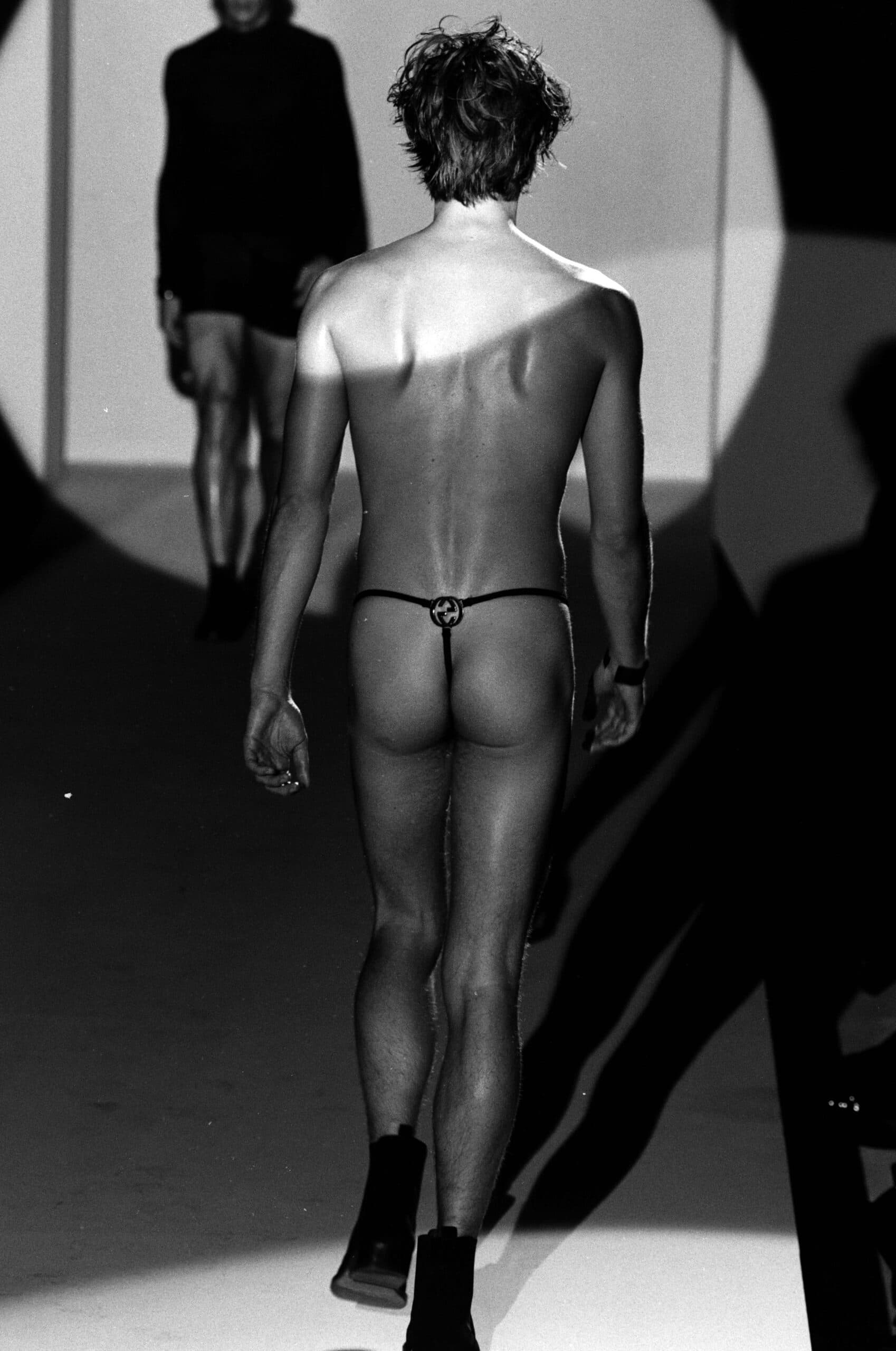 Amy Sussman/Getty ImagesThis serves as a direct reference to Tom Ford's Spring/Summer 1997 collections for Gucci (womenswear and menswear alike) where models walked the Milan runway in sheers and underwear of different cuts, including g-string thongs with the unmistakable Gucci emblem.
