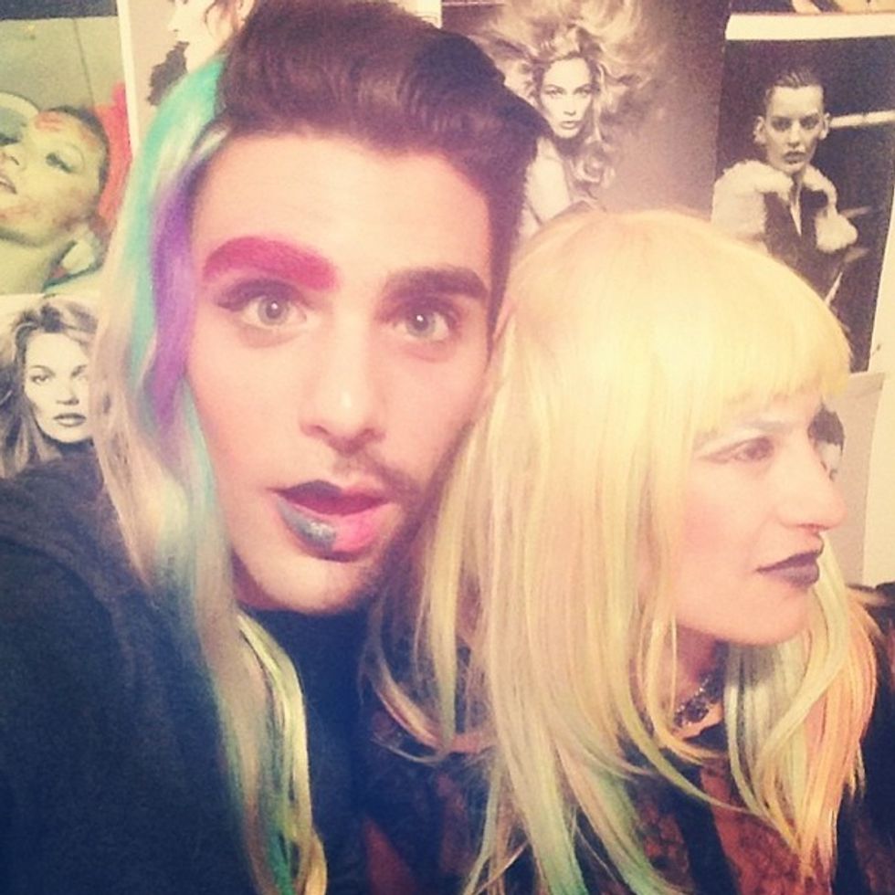 "My most memorable Halloween was last year. Basically, I had absolutely no plans to do anything at all, but then my friend Leslie (Kirchhoff, she's a DJ) announced that she'd be spinning at Boom Boom and got me and a couple of my pals plus ones. The only problem was, I had zero costume ideas and I think I got off of work at, like, 8 PM that night. COMPLETELY at the last minute, I called up my friend Aura Friedman, who's a colorist at Sally Hershberger, and she came over with her friend, Glenn, who's now a stylist at Marie Robinson. Aura came with all of these crazy rainbow wigs that she'd custom-made, so we got inspired, and then we just started haphazardly applying all of this wild costume makeup I had called in for a Dia De Los Muertos thing I did a couple nights before. I shaved half of my face and laid on piles of concealer and did a fairly heavy contour and added fuchsia eyeshadow all over my brows and put on this weird metallic cream shadow for lipstick, all while Glenn was applying weave glue to my head and blowdrying the piece so it would stay put. Aura basically did sort of the same thing, except it was even weirder... but still pretty somehow. The funny part is, getting ready was the best part. But maybe that's because the rest is all fuzzy! I remember at, like, 10 AM Glenn was knocking on my door with Starbucks and I was like, SHIT! I'm late for work! But it was so worth it... and even though we had never hung out outside of a working environment before, all of us ended up being close friends. In fact, I was just with that same crew of people celebrating Aura's birthday last Friday!