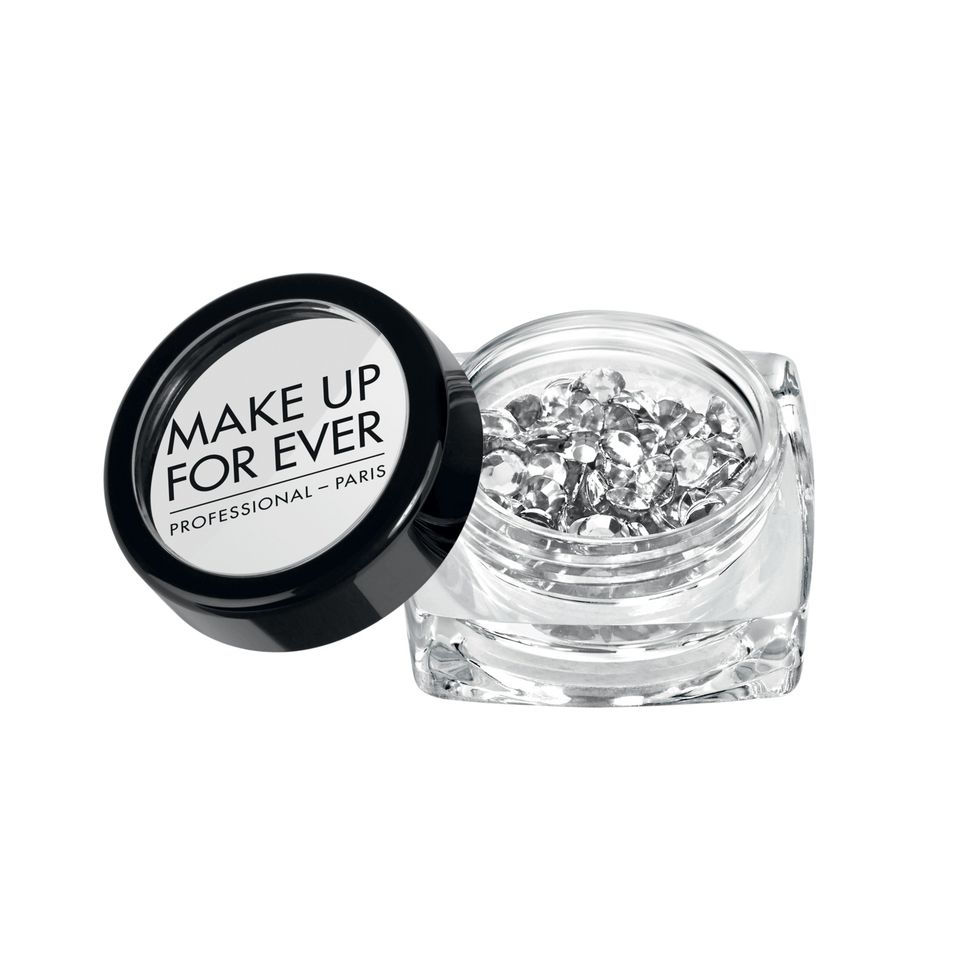 “Apply Diamond Strass rhinestones to outer and inner corner of eyelids using a pair of tweezers. Apply lash glue onto bottom of Strass to make them stick to lids. Finally, apply Artist Rouge in a shade that matches your skin tone.”