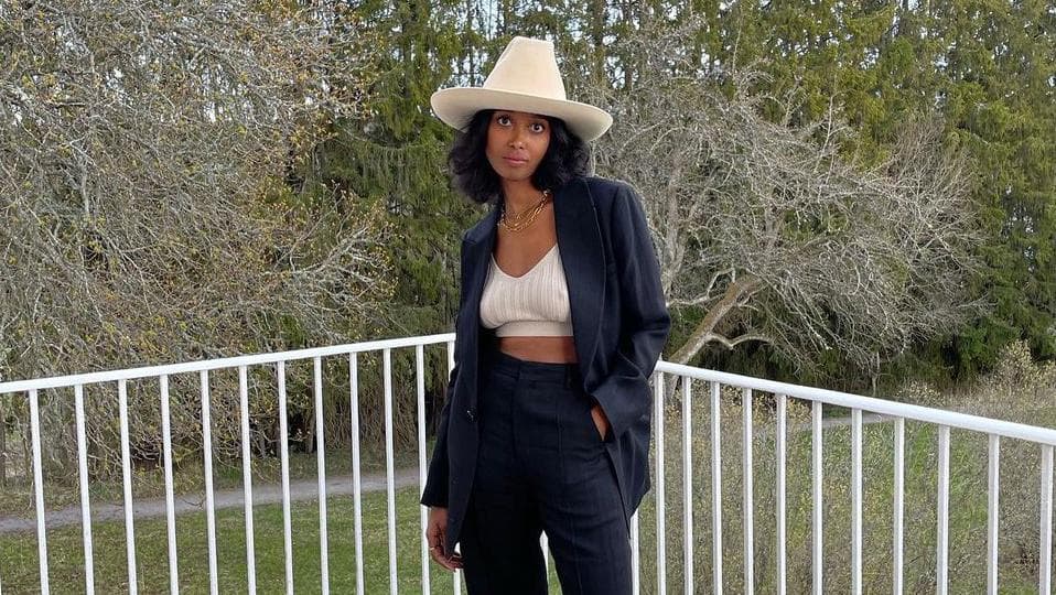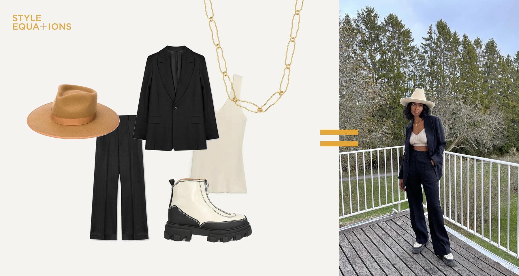 Right photo: Courtesy of Instagram/@monamali_This modern take on suiting is anything but boring. The addition of a knit tank, chunky boots, and the wide-brim fedora (the star of the show) keep the ensemble casual and exude the energy of the fall season.