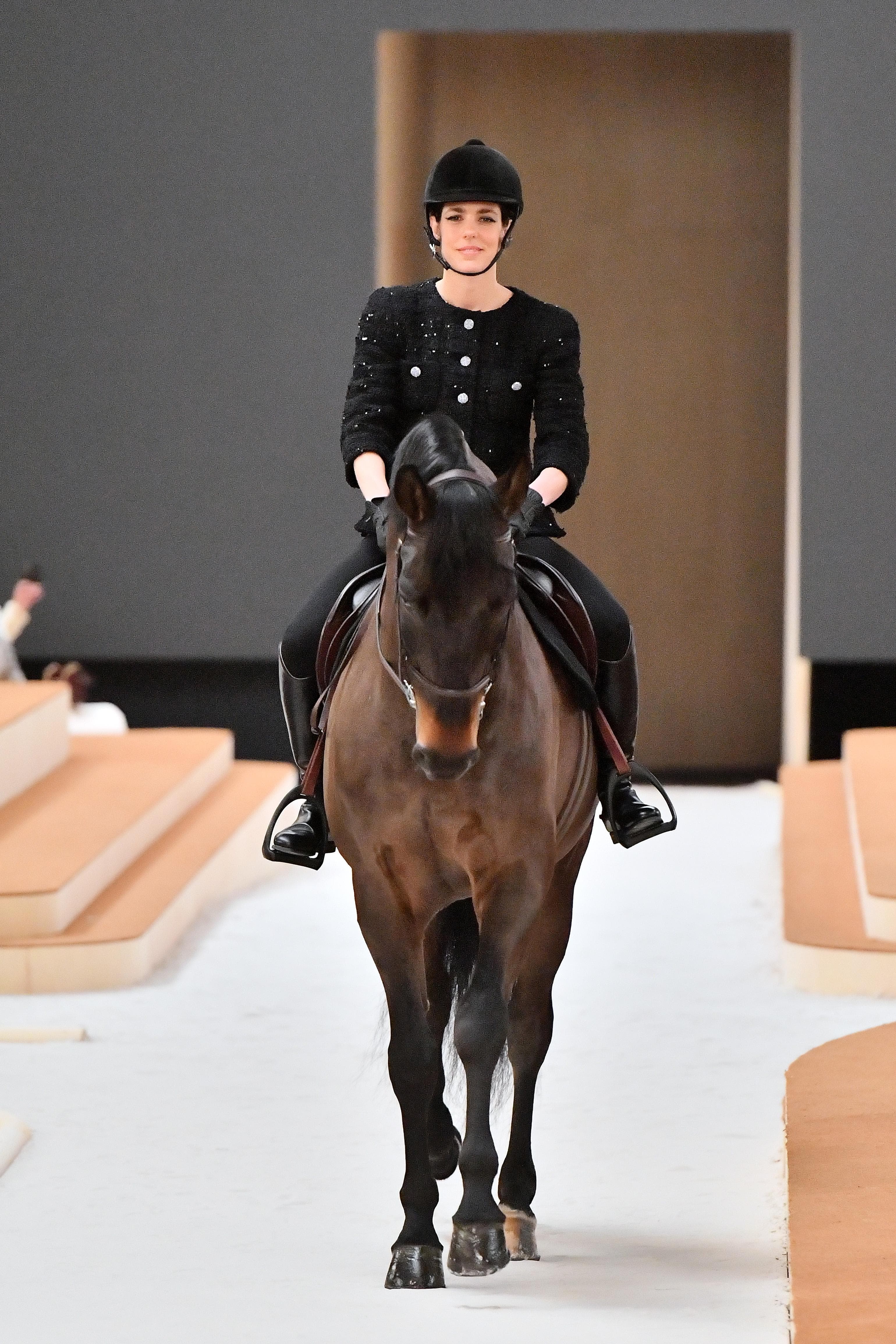 Photo: Dominique Charriau/GettyHere, Charlotte Casiraghi, princess of Monaco, rides her 8-year-old Spanish bay horse down the runway in a look that beautifully marries sport and the most magnificent tailoring and detailing from the brand’s artisans. It’s perfection, through and through.