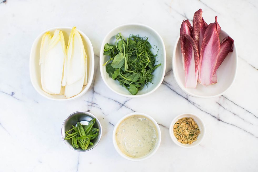Toss two heads of yellow endive in 1/4 cup dressing, place on plate. In clean bowl, toss red endive and snap peas in agromato lemon oil. Place on top of yellow endive. Garnish with breadcrumbs and pea tendrils. Yields 4 servings.