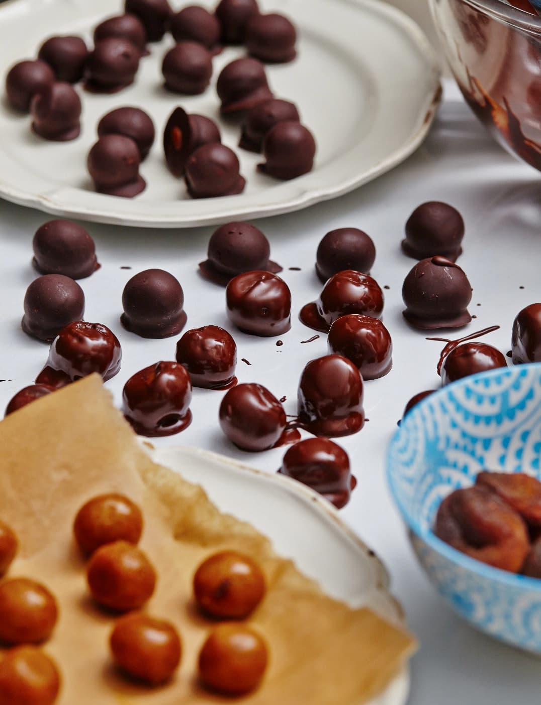 two >> Use a teaspoon to scoop out enough apricot mixture to make 1½ cm diameter balls. Roll the mixture between the palms of your hands and place each caramel onto a baking tray lined with baking parchment (if you are struggling, pop the mixture in the freezer for 10 minutes or longer then try again).