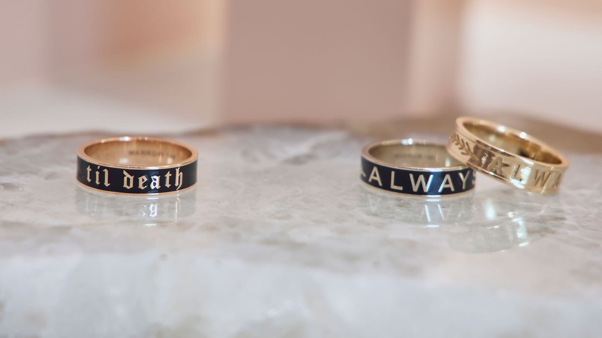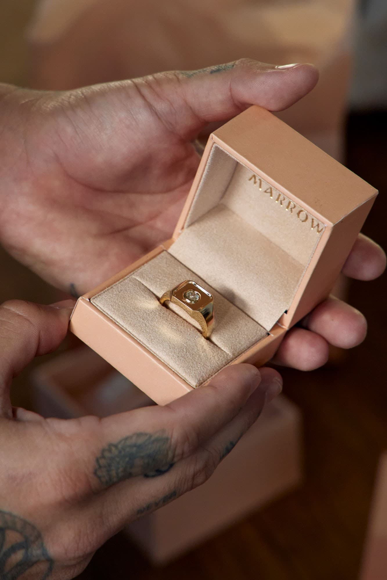 JS: “I interviewed Marc to learn more about him and his style. He’s not necessarily a traditional jewelry guy, but he said, ‘In honor of my grandpa, who wears this big signet ring, I want to take a bold step. I want to wear something that honors him that is a bold statement piece.” His grandfather’s ring has some etching and flourish details, and I knew he didn’t really want all that—he wanted a big signet without the additional flourishes and something that would suit his lifestyle as an everyday ring.