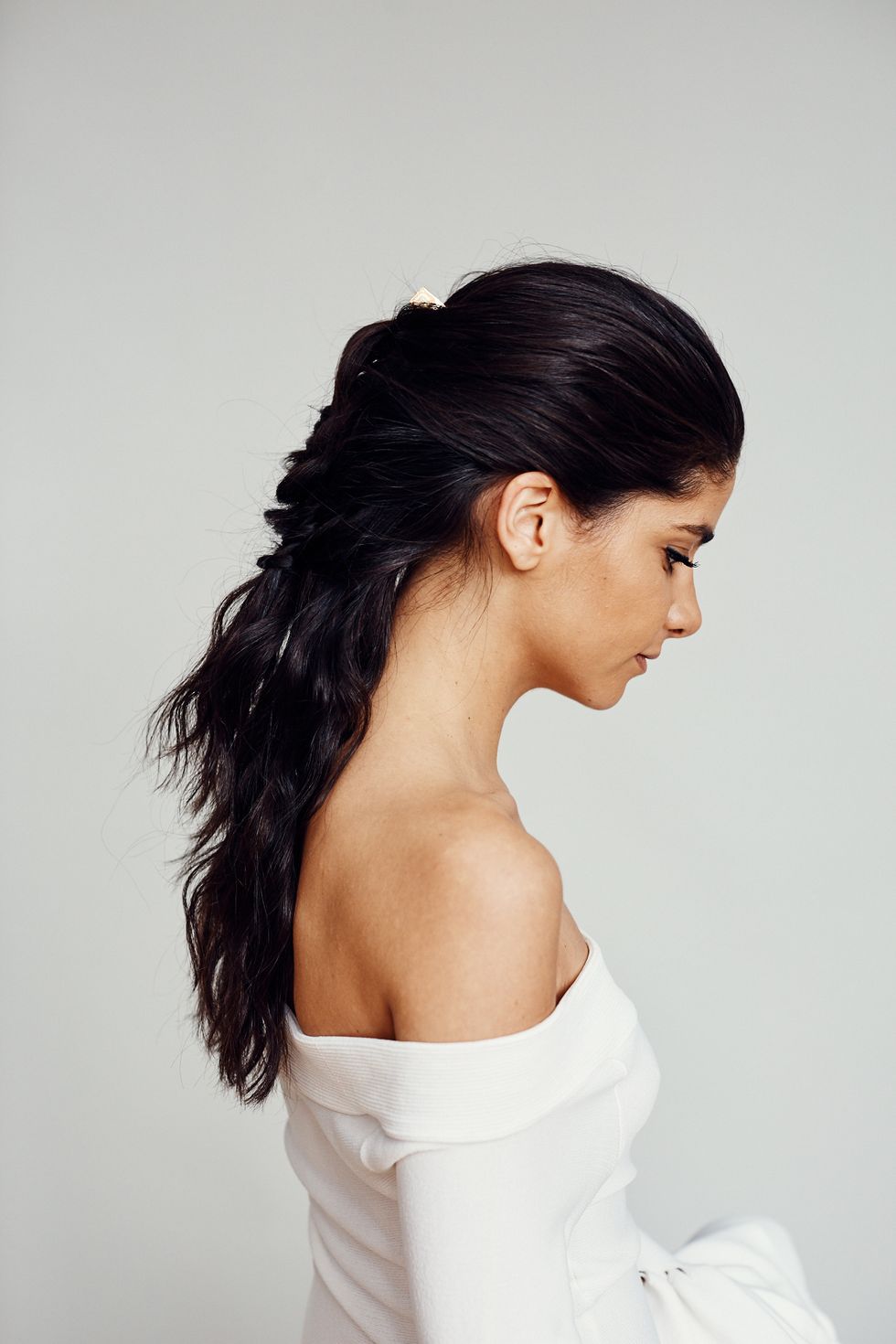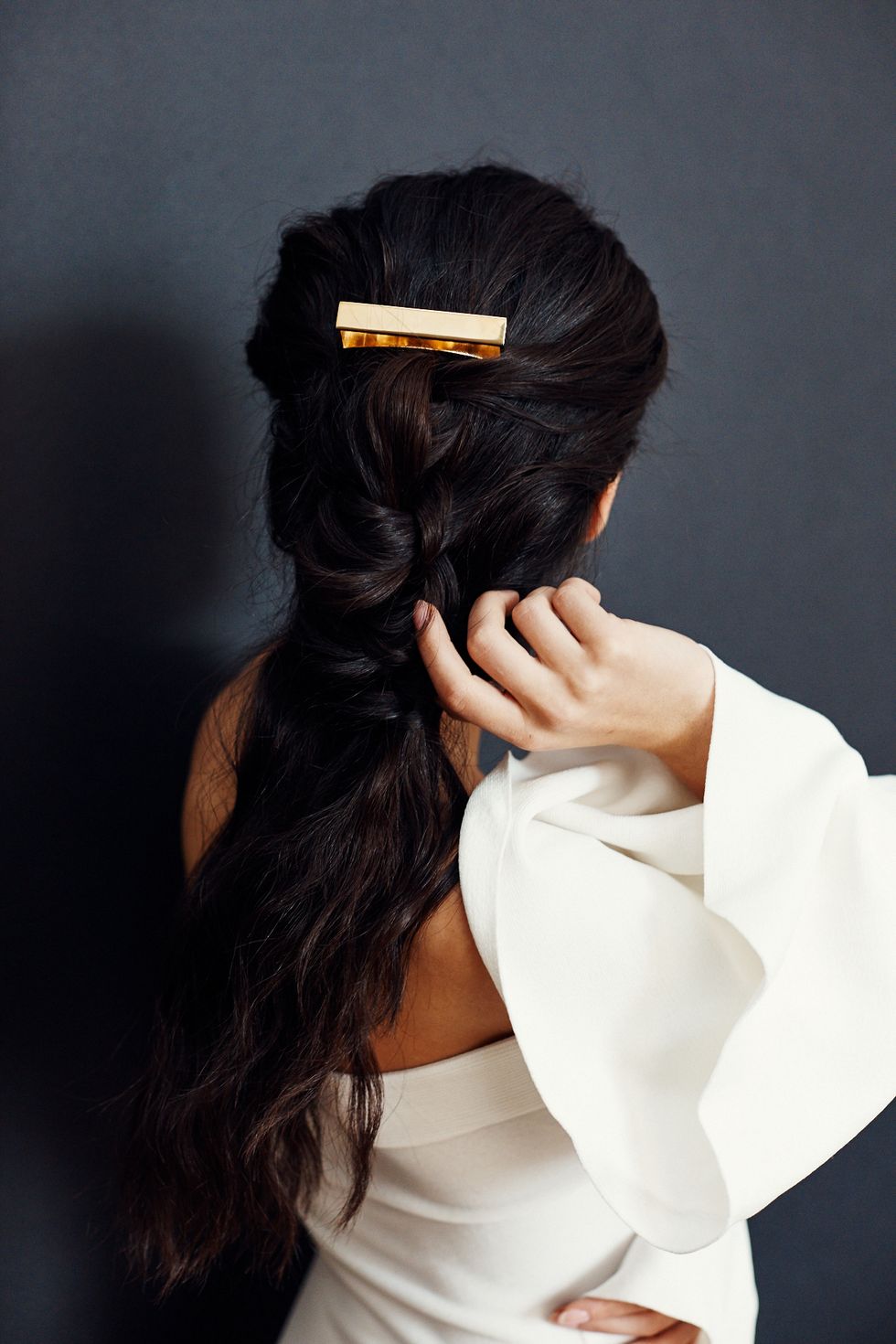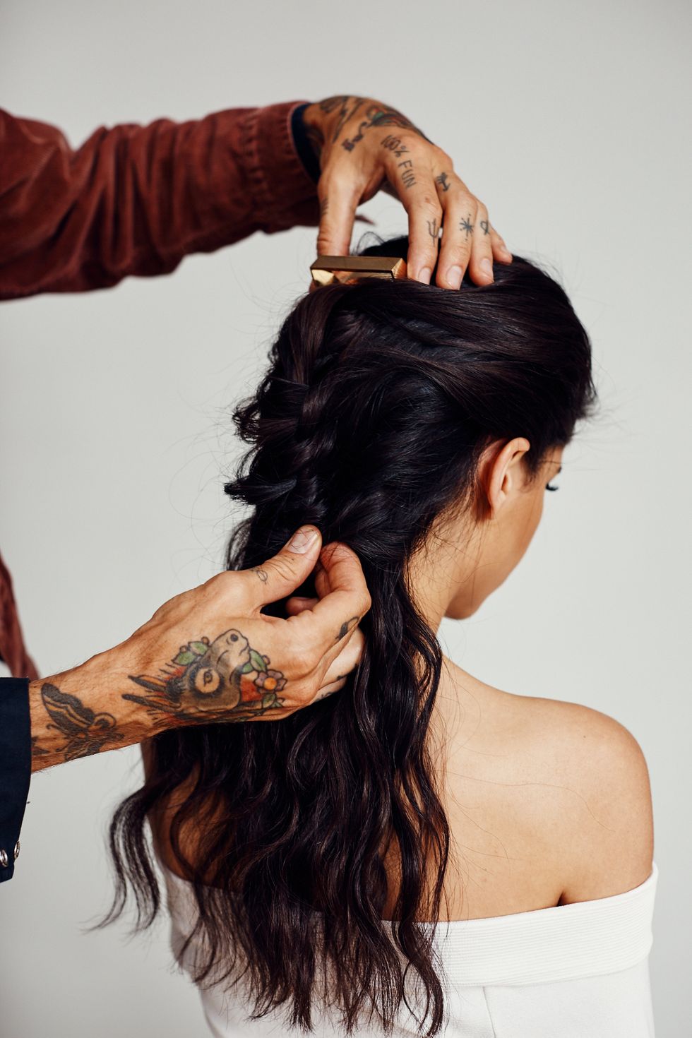 HOW TO: The cool thing here? It’s not a braid. “We’re just tying knots in the hair,” says Pecis. That means taking two pieces from either side and looping them together. First you take the center section, and you pull that straight back. Next, take hair from both sides and tie it in a knot over the top. Then you just keep adding and adding. “It’s even easier than a braid,” he says. “You’re just tying knots straight down. It’s romantic, controlled, but down.” Finally, he adds a pretty gold barrette for a party-perfect finish.