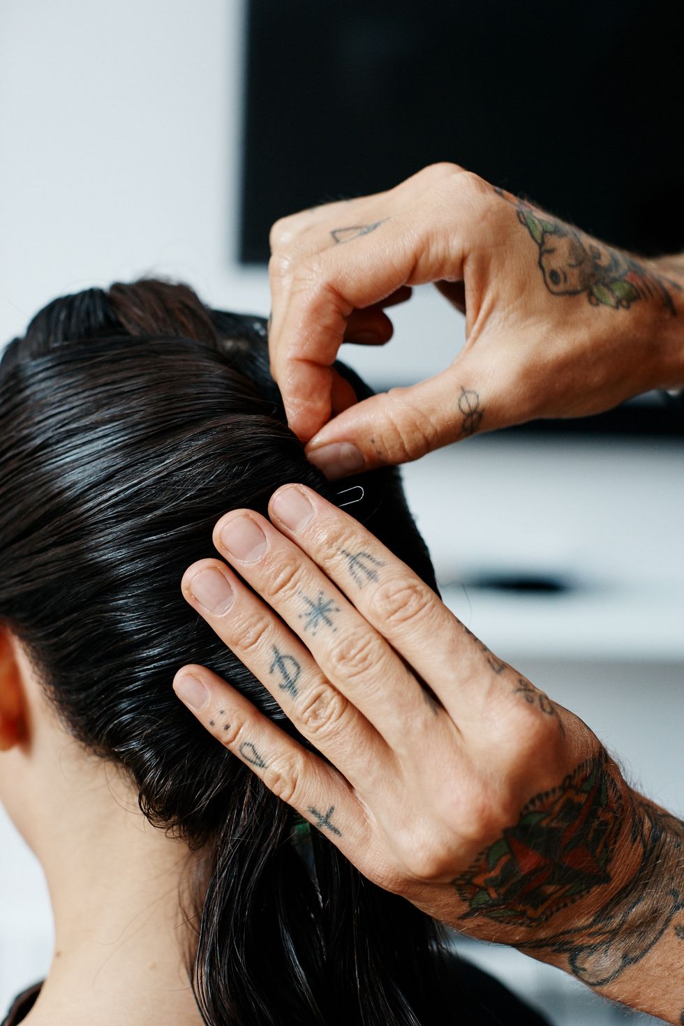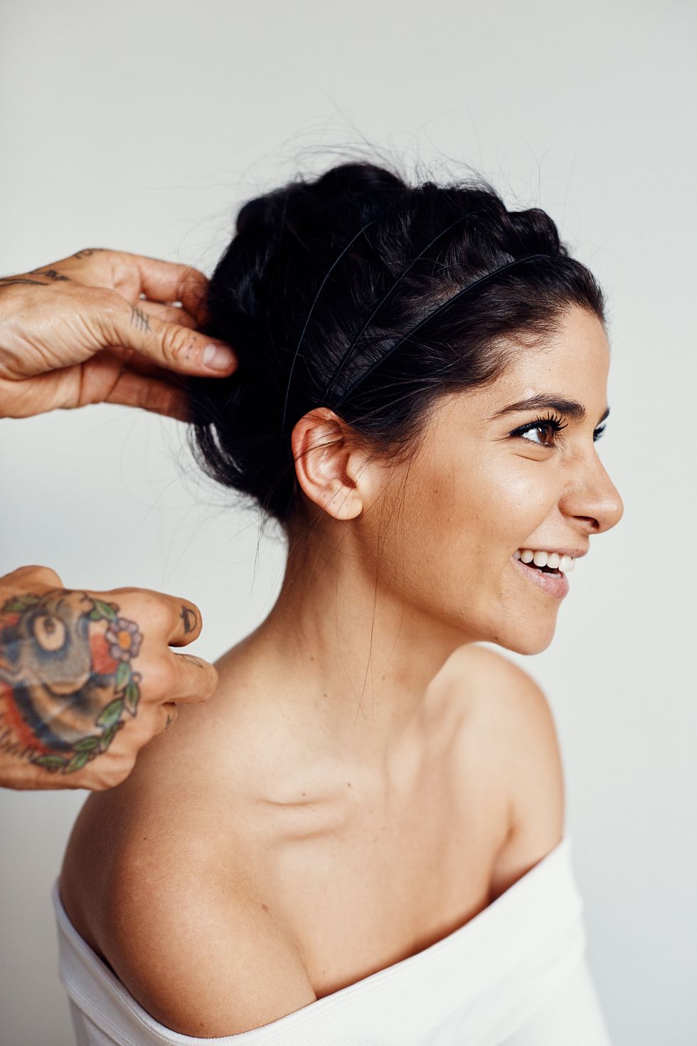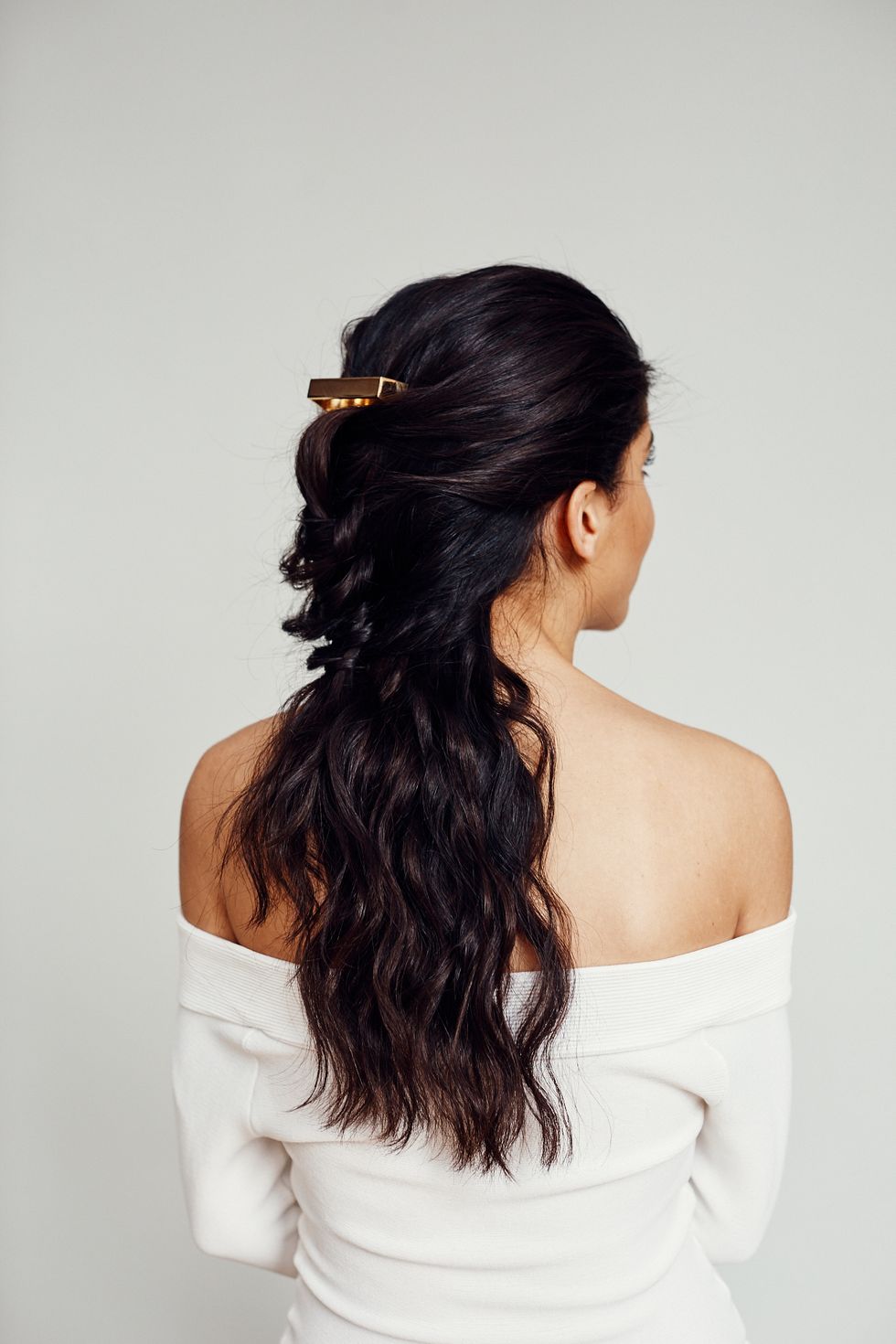 HOW TO: The cool thing here? It’s not a braid. “We’re just tying knots in the hair,” says Pecis. That means taking two pieces from either side and looping them together. First you take the center section, and you pull that straight back. Next, take hair from both sides and tie it in a knot over the top. Then you just keep adding and adding. “It’s even easier than a braid,” he says. “You’re just tying knots straight down. It’s romantic, controlled, but down.” Finally, he adds a pretty gold barrette for a party-perfect finish.