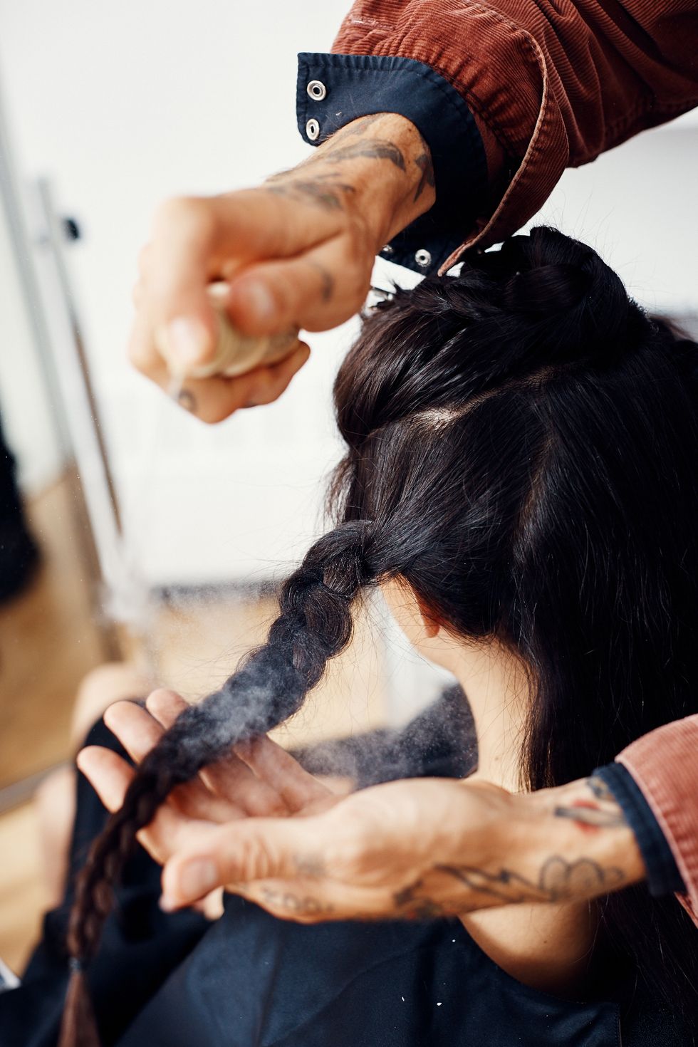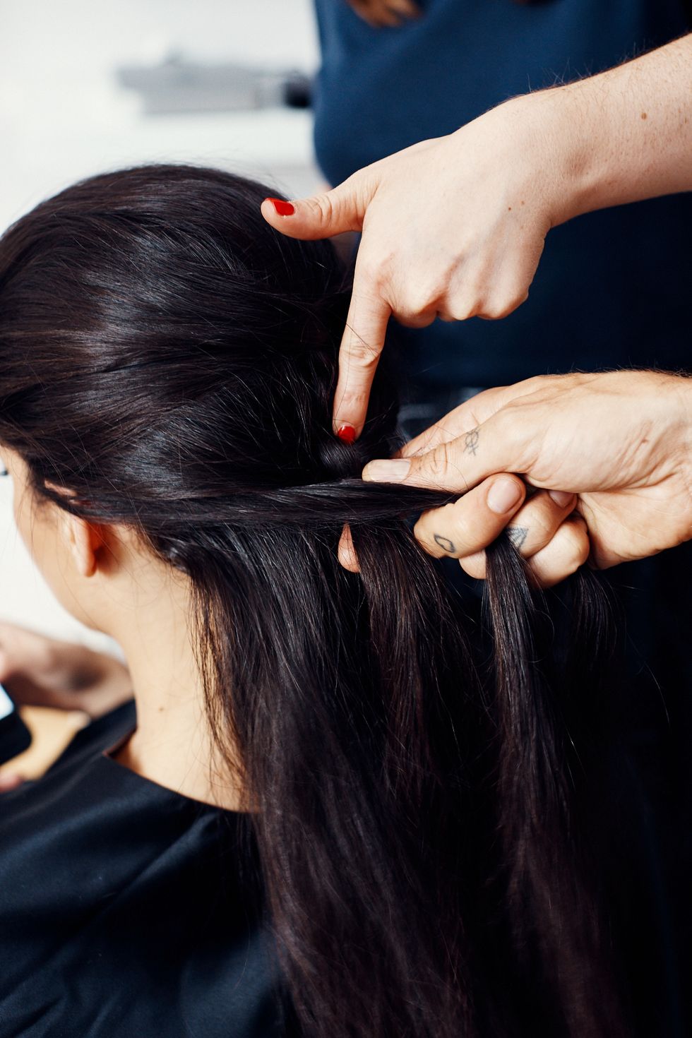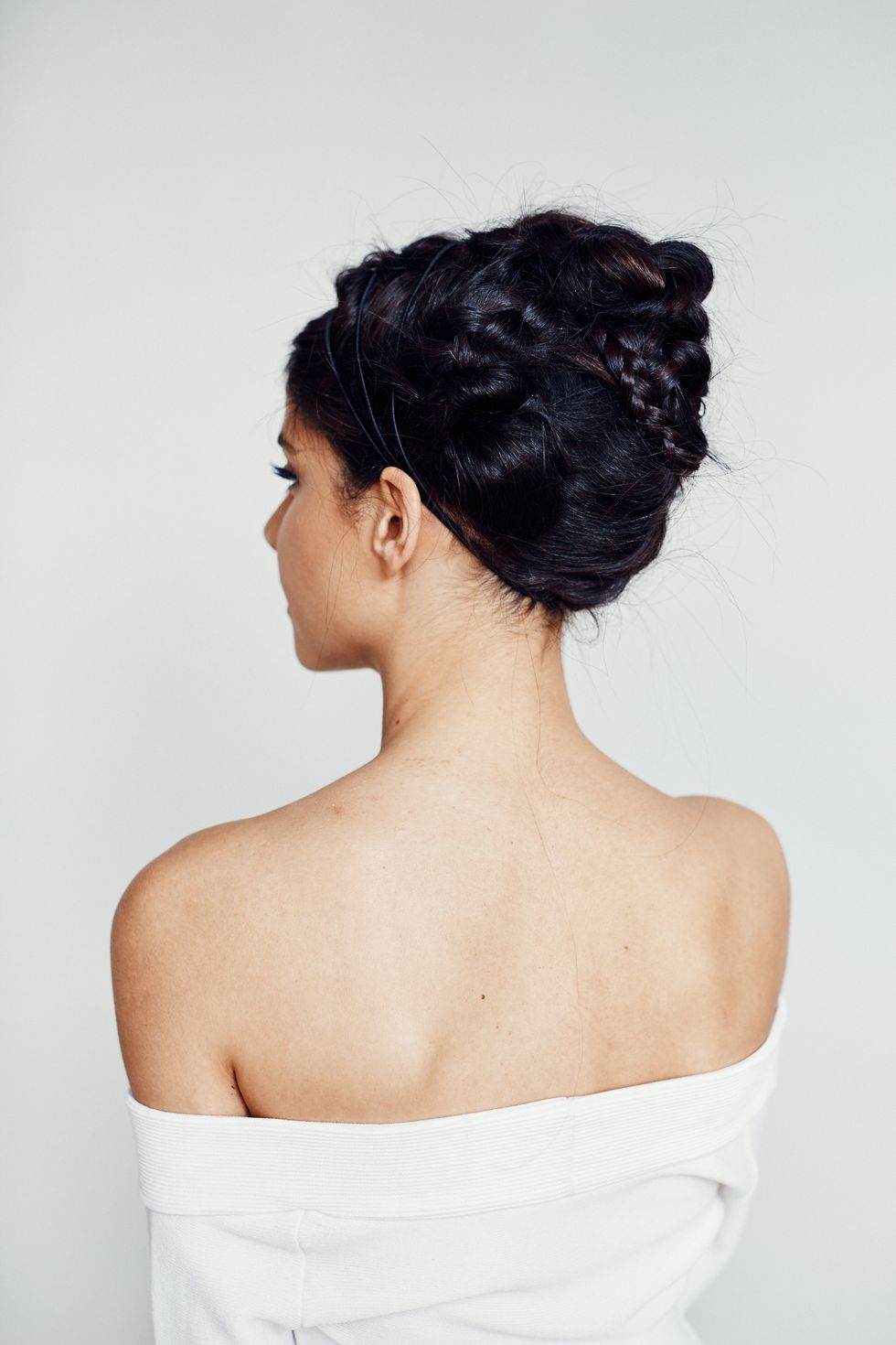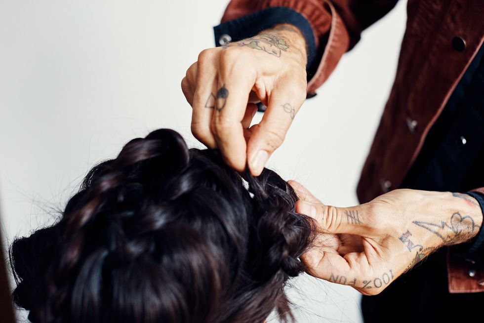 HOW-TO: To build the foundation of this updo, Pecis suggests using Oribe Maximista Thickening Spray and blow-drying everything away from the face (he uses the Dyson Supersonic Hair Dryer). Then, make four sections of braids: The top one is essentially a really loose corn row going back, he says, and then the sides and the back are typical three-strand braids. Loosen the braids a bit by pulling them open, and give them a dusting of Oribe Swept Up for texture. You’ll pull those three into the crown—one by one, pinning them back separately and wrapping them around, creating more height in the back of the head. Then the top section is your last one to go back, which you tuck inside. Just keep massaging the braids, he says, then add the three elastic headbands to create more ridges and shape. Finish with hair spray.