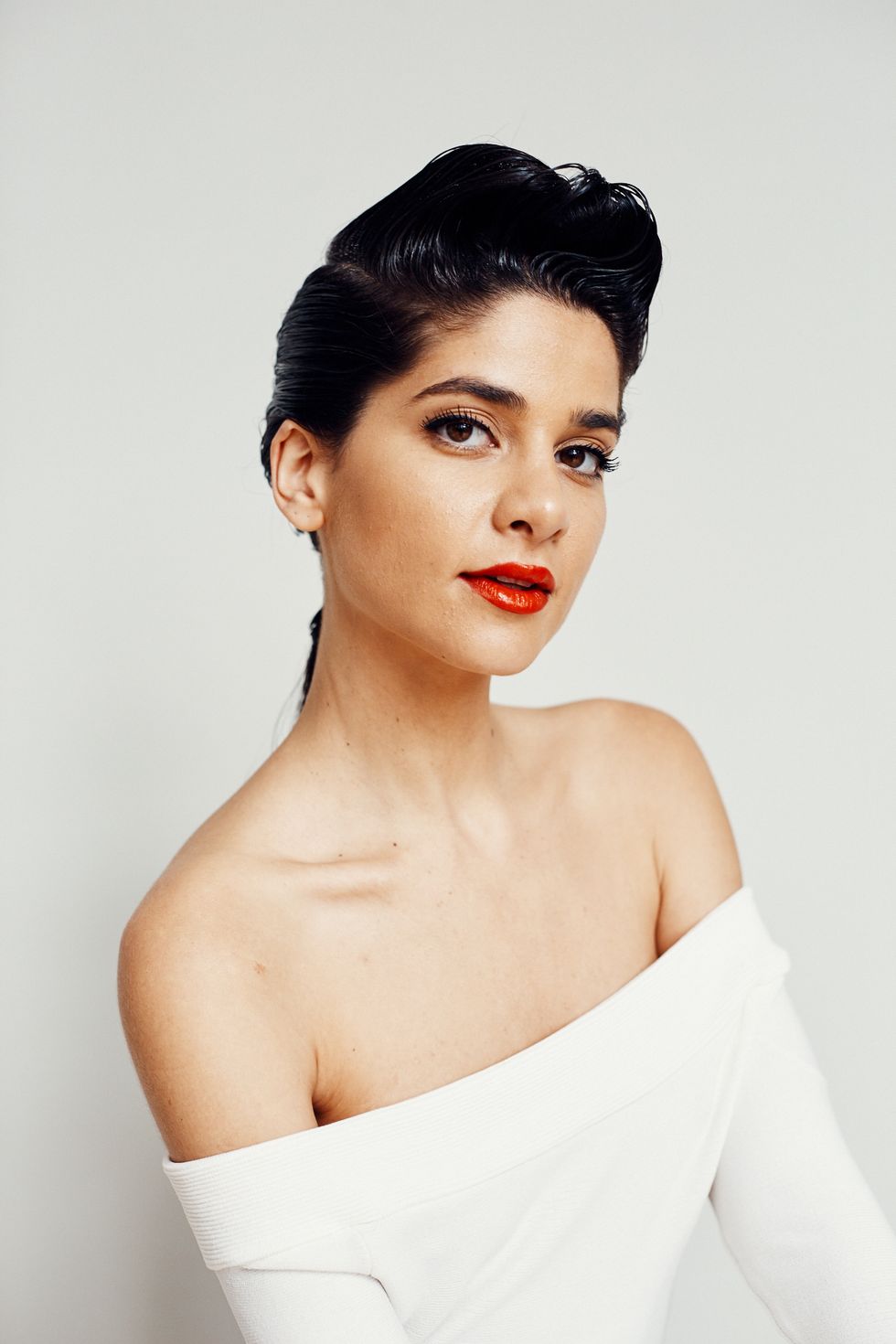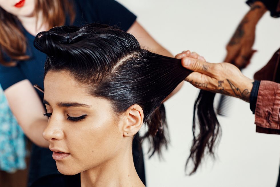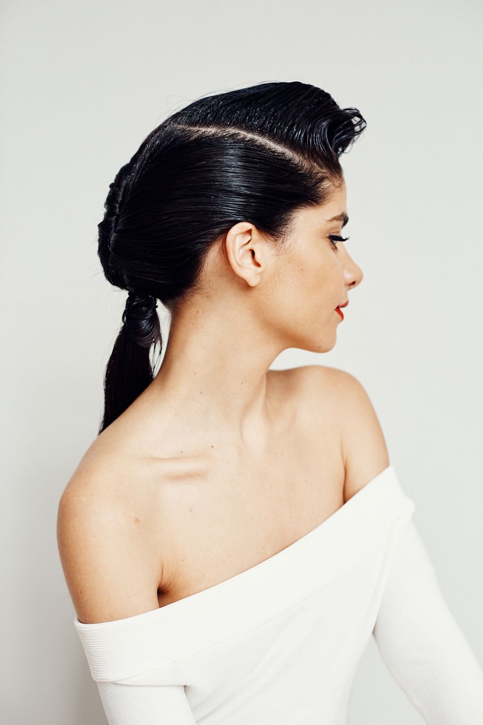 HOW TO: This retro look can be sexy and feminine with high shine. First, take out a horseshoe section of hair at the crown and saturate it with Oribe Surfcomber Tousled Texture Mousse, combing it straight up. Put a rubber band on it halfway down, and start pushing it forward to build the height in the front. Pin that down with some bobby pins, then separate the rest of the hair into two sections. Coat each one with texture mousse, and create two upside-down French twists on each side, with the ends hanging out of the bottom. Tie the ends together. Finally, use Oribe Shine Light Reflecting Spray over the whole thing. “Lots of shine,” says Pecis.