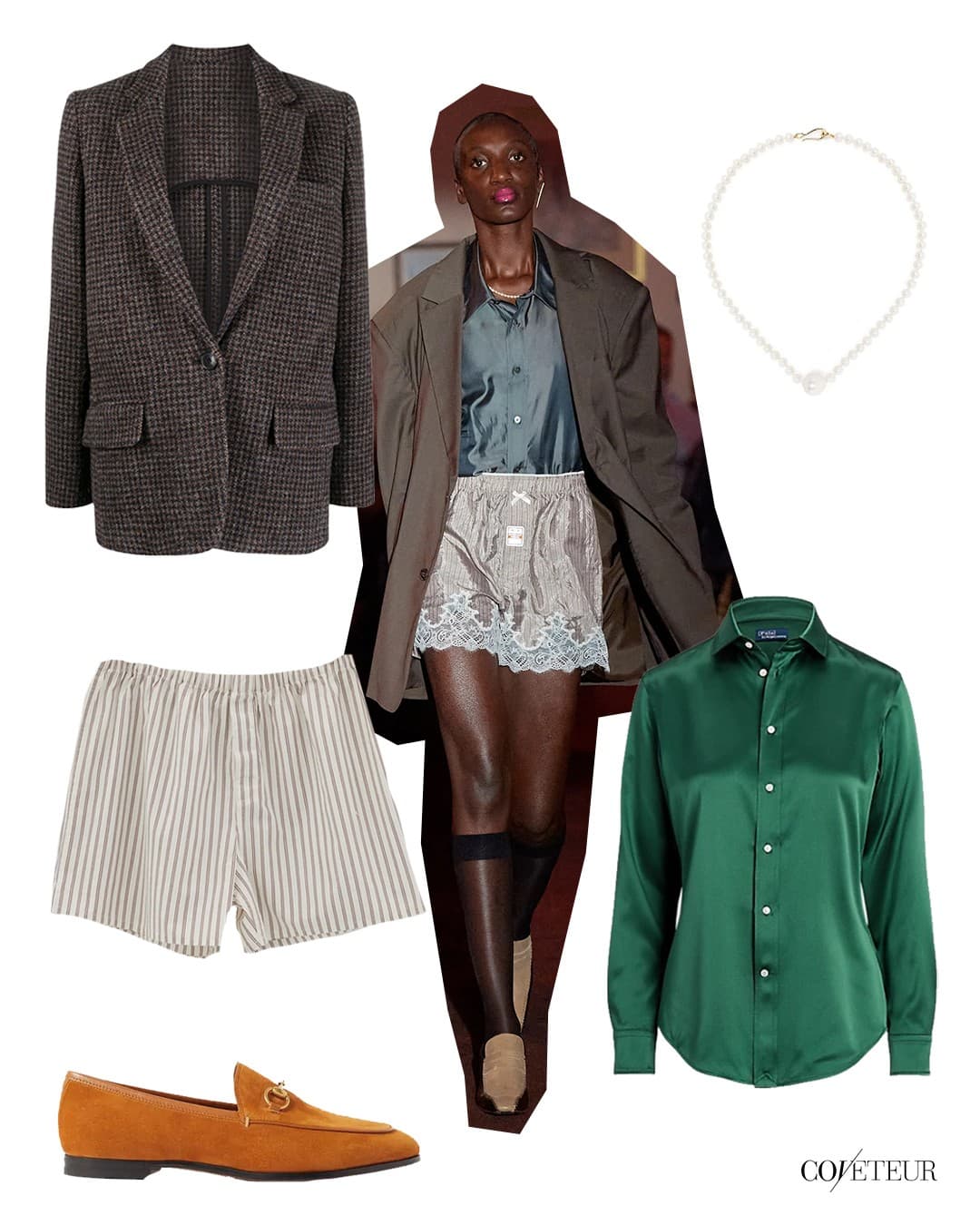 Silk Shirt + Lace-embellished Shorts + Plaid Blazer