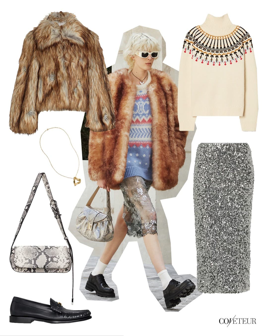 Embellished Dress + Fur Jacket + Loafers