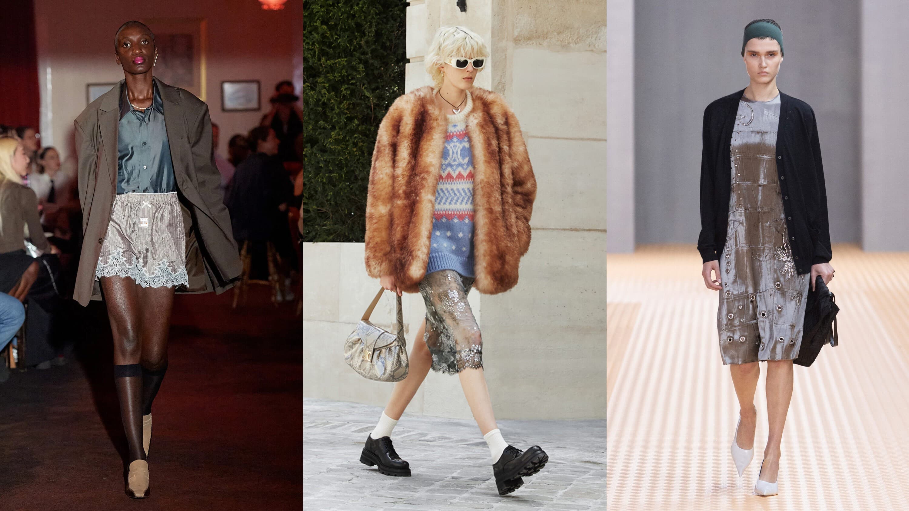 CelineIf there’s one thing Anthony Vacarello’s Celine has expertise in, it’s putting a youthful, girlish twist on feminine staples. In this look, they paired a slinky embellished skirt with a fur jacket and fair isle knit. But the real shake-up comes in the footwear: white socks and loafers.