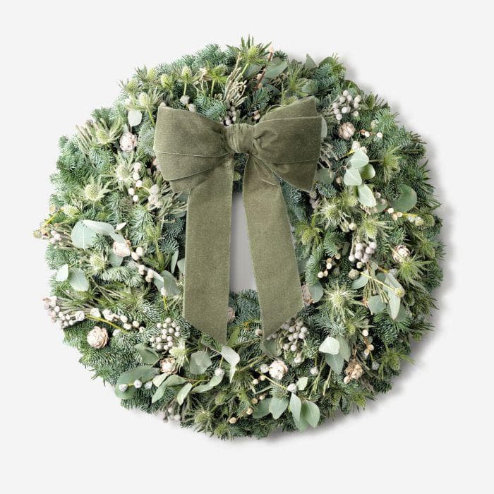 This winter white wreath is handcrafted with natural douglas and nobilis fir, berried eucalyptus populus, silver brunia, pussy willow branches, and alpine cones. The fact that it’s not coated in red and green means you can keep this on your door all season.