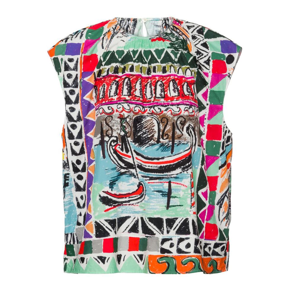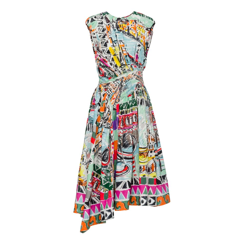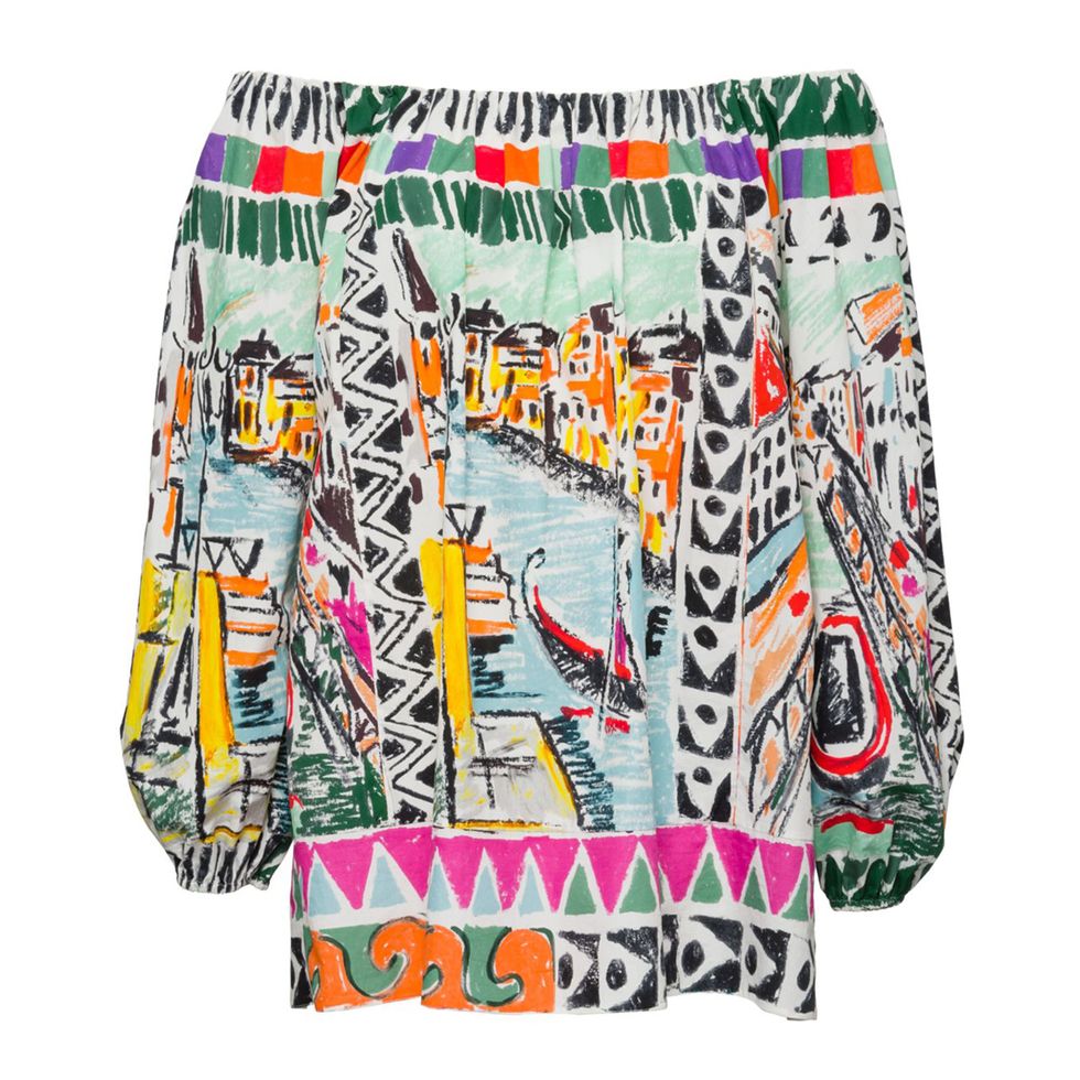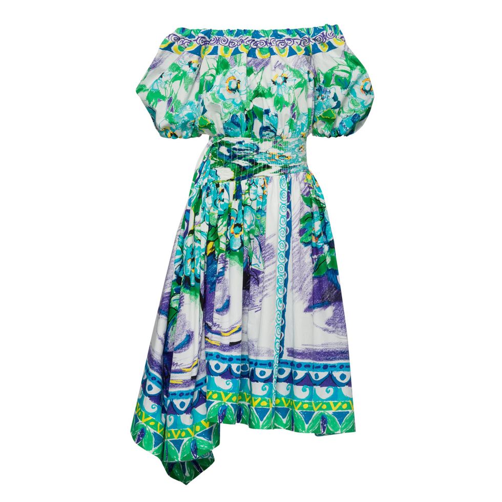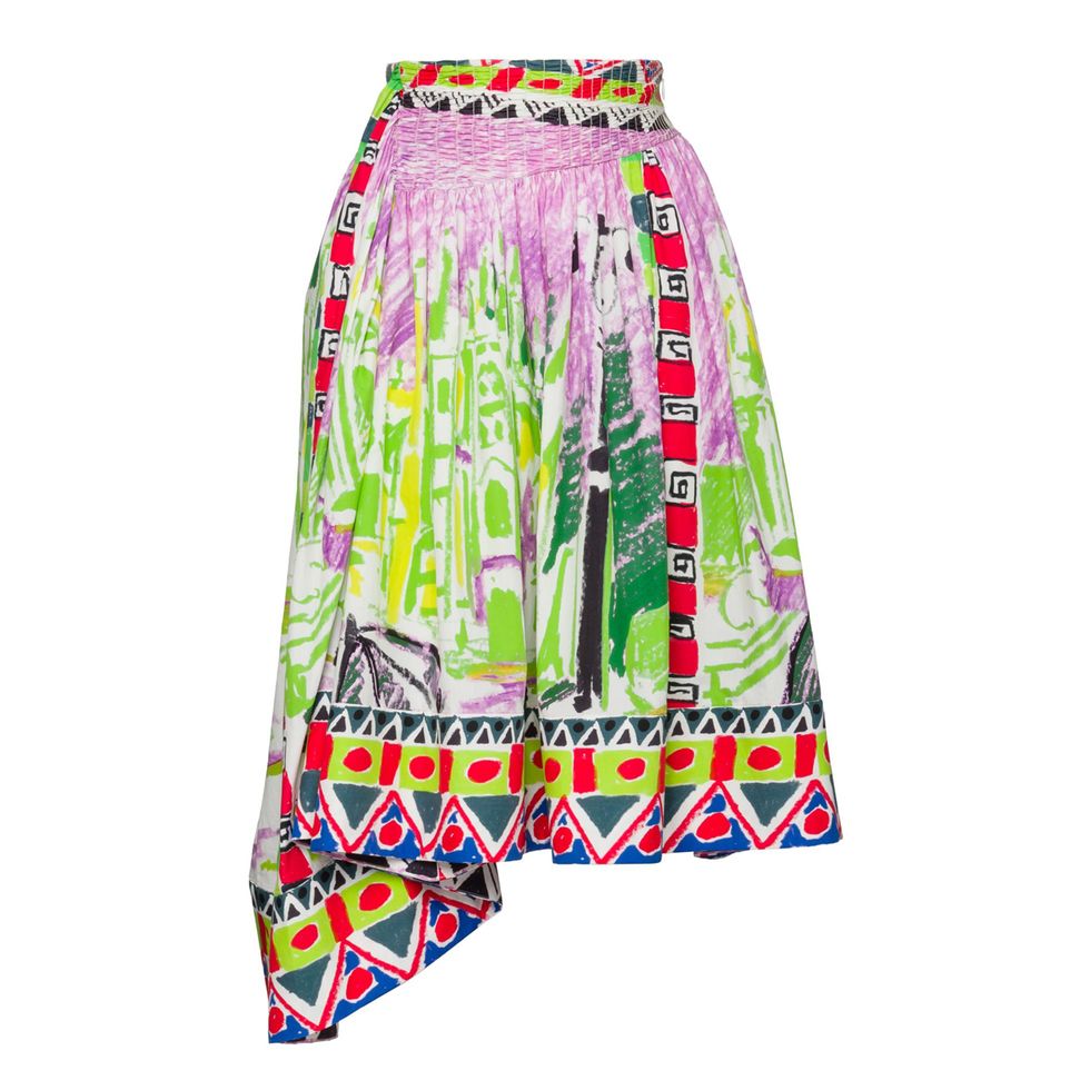 “The off-the-shoulder top and very full, A-line Prada skirt. I like that all the prints are kind of similar within the same family, but with nice little changes in the colors to make each piece special.”