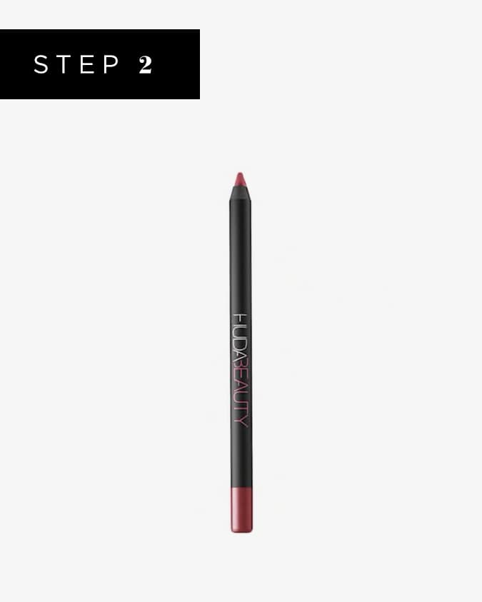 Close the mouth and then line the inner center, right where your lips meet, with Huda Beauty Lip Contour Pencil in Trophy Wife.