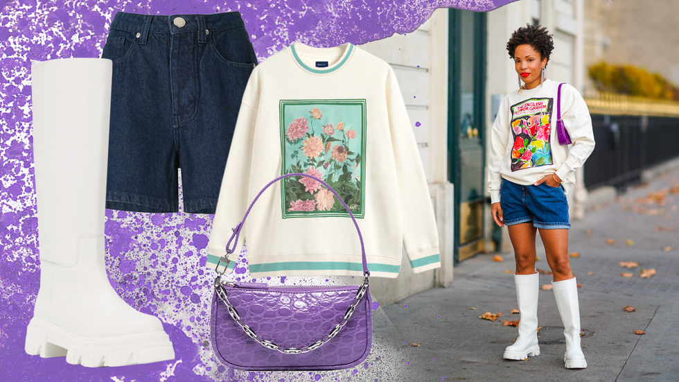 This outfit makes the strongest case for jorts I’ve seen in a long time and is a fabulous example of repurposing winter boots for summer. For hotter days, you could replace the sweatshirt with an oversized T-shirt or a breezy button-up. On cooler days, simply throw on a jacket (I'd do something at about the same length or slightly longer than the inseam of your shorts).