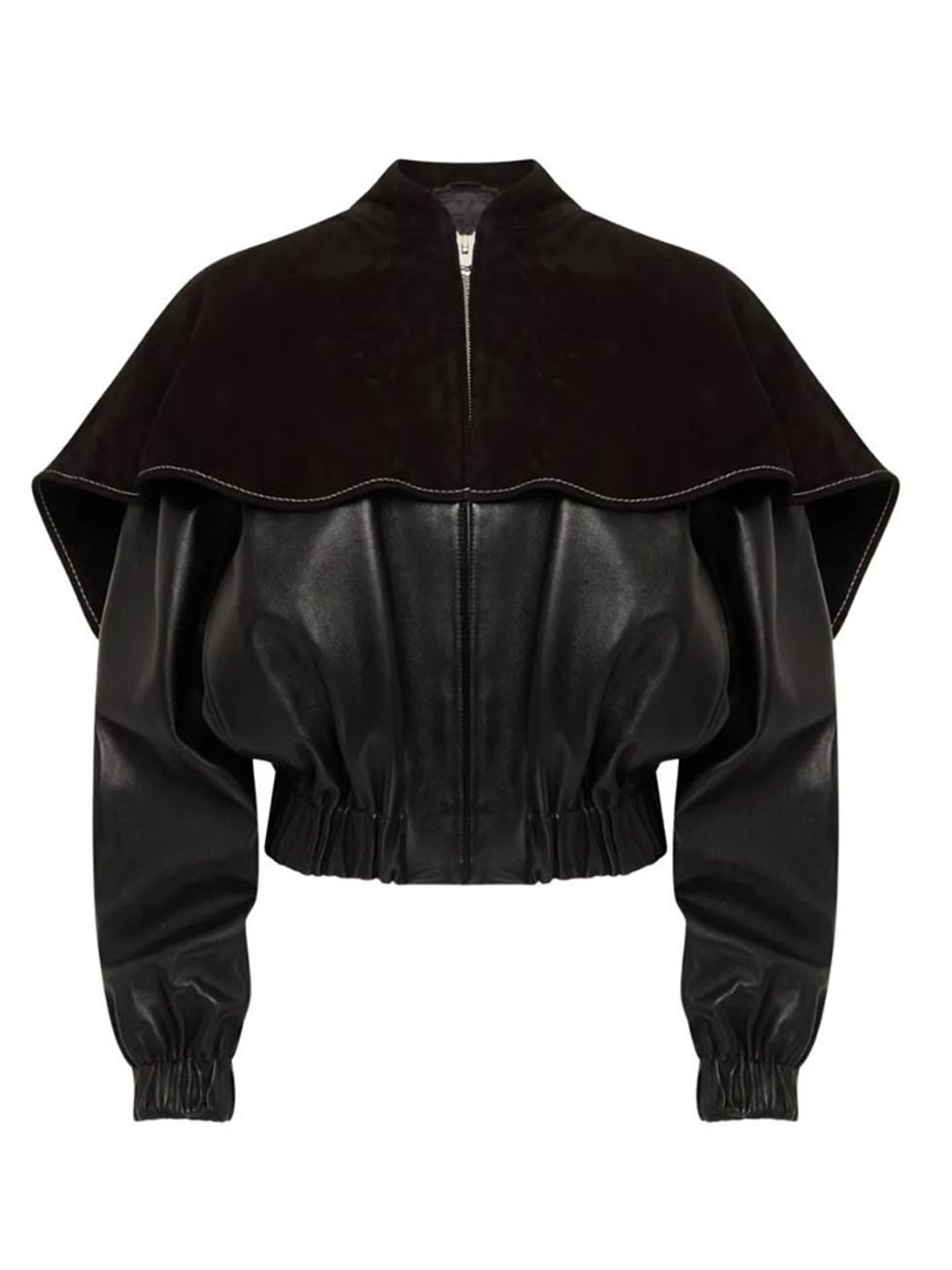 Another great look from Balenciaga's Spring/Summer 2026 collection was this more casual moment, perfect for the office or errands on the weekend. Pair your poncho/bomber hybrid with straight leg jeans and flats for an easy look. Don't forget the oversized top handle bag for all your wares!
