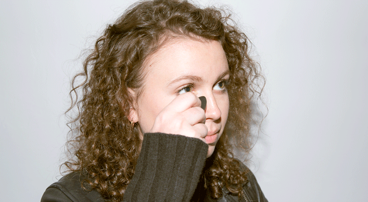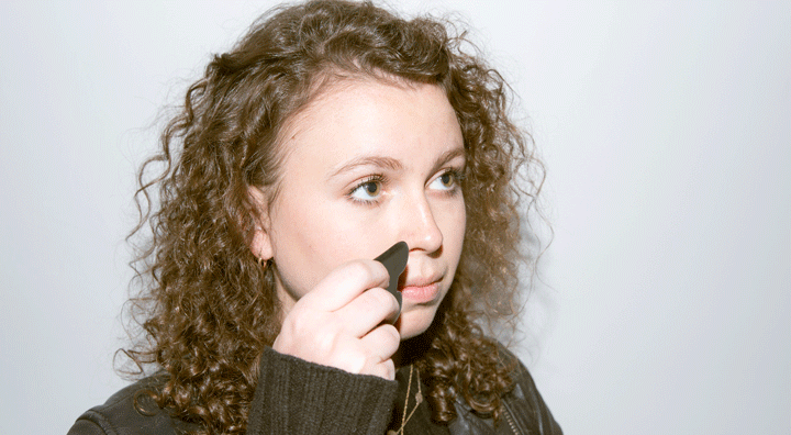 1. Start by applying gentle but firm pressure to work the gua sha tool—with the ridge side down—moving in small concentric circles from the middle of your forehead out towards your temples, all the way to the hairline.