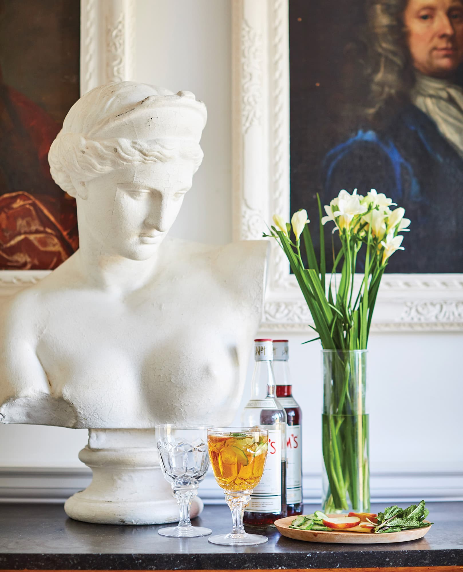 “My entertaining style changes by season. Here I would probably be putting dark greens on the table or something, but the backbone to how I entertain remains the same. I always want a pretty table. I always love fresh flowers. I always have to use old jam jars. I don’t want it to look pretentious. I want it to be easy, but I want it to be pretty. I want someone to come away from a meal and just think, ‘That was so lovely.’ The principles remain the same. Invite interesting people. Seat people carefully. Make sure the lighting is bloody flattering, especially now. I’m 53, I’ve got to think about the lighting all the time.”