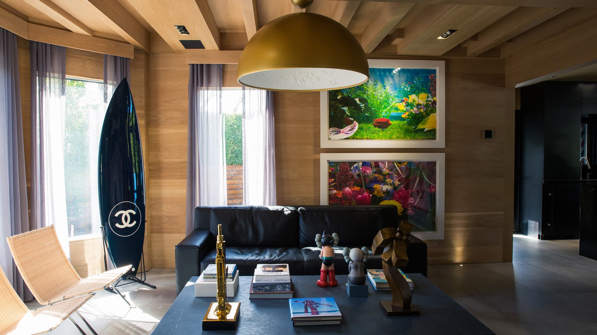 “We’re kind of modernists, as you can see,” Hirshleifer says, walking us through the two-story, four-bedroom home. The exterior is charcoal, the tiled floors are intended to look like cement, and the art collection could hold its own at MoMA—a Basquiat here, a Murakami there, a Damien Hirst there, there, and there. Lori and David’s son, Rob, has worked closely with his father to find, and in some cases commission, many of the works.