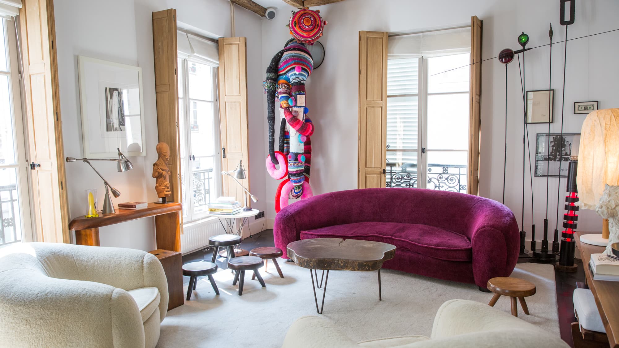 On a small street in Paris’ Saint-Germain-des-Pres neighborhood, Alexandra Roos buzzes us into a garden courtyard, which serves as the front yard of the perfumer’s town house. It’s romantic and quiet, and the front door to her home is propped open. After we enter, with no Roos yet in sight, we’re suddenly startled by a figure leaning against the wall. We’re just about to try speaking to her when we realize it’s just a very, very (very!) realistic statue. Add gallery owner to the list: Roos’ place doubles as her family’s home as well as an extension of her husband’s gallery. The entire space is covered in modern art statues and canvases.