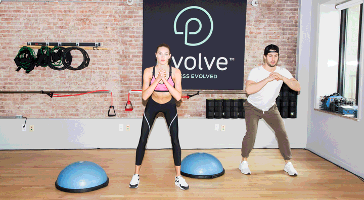 “Start in a P.sit with your feet hip-width apart and the Bosu ball directly out at 3 or 9 o’clock position. Step out 90 degrees onto the side of the ball, pushing the ball of your foot into the ball while keeping the heel up. Rotate your foot out, and your hips will internally rotate away from the ball. Hold and squeeze. Return to original P.sit position.”