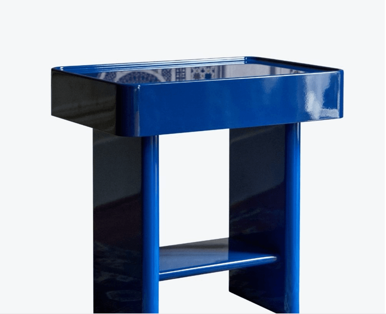 "We're always thinking about the balance or dialogue in an interior scheme. Individual pieces should speak to each other, but nothing should shout. It's almost like a philharmonic orchestra—there's perhaps a star violin, but she is always supported by the rest of the instruments. When we work with a stronger piece like Apollo, our two-tone lacquered cobalt side table, we often soften it a touch by putting it next to a velvet chair or place some lovely flowers in a vase on top of it." —CR