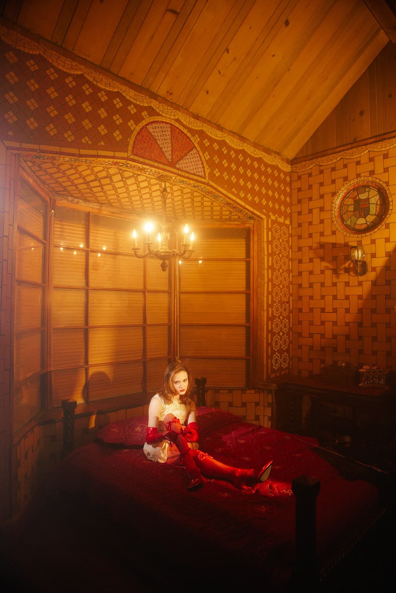LC: “Although that was the starting point, I think Iris and the location shaped it into something else. They really made it their own. Firstly, Iris has a very serene energy about her—there is a gentleness about her that fits in the house in a kind of Joan of Arc way because the house itself has so much history. We took photos at the Mosaic House, which was the house of architect George Ehling. He built the entire thing by hand, a single person. According to his wife, who now owns the place, he laid the last tile and told her, ‘It is done,’ and then passed on the next day. So, the whole thing is very biblical. Being what it was, the house was also a character in the story, and it took us a little away from Batman and pushed us more into Joan of Arc territory.”
