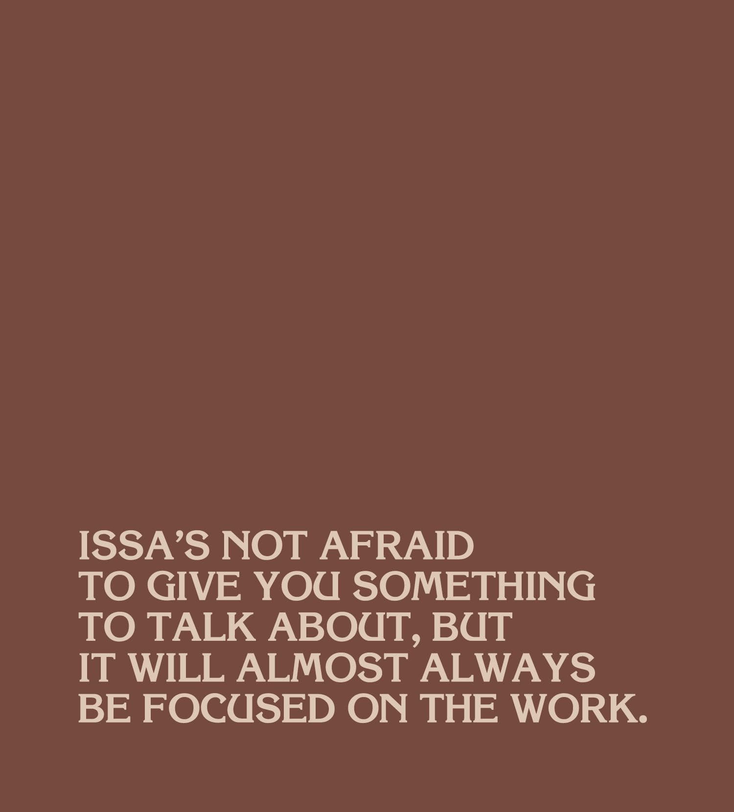 Issa's not afraid to give you something to talk about, but it will almost always be focused on the work.