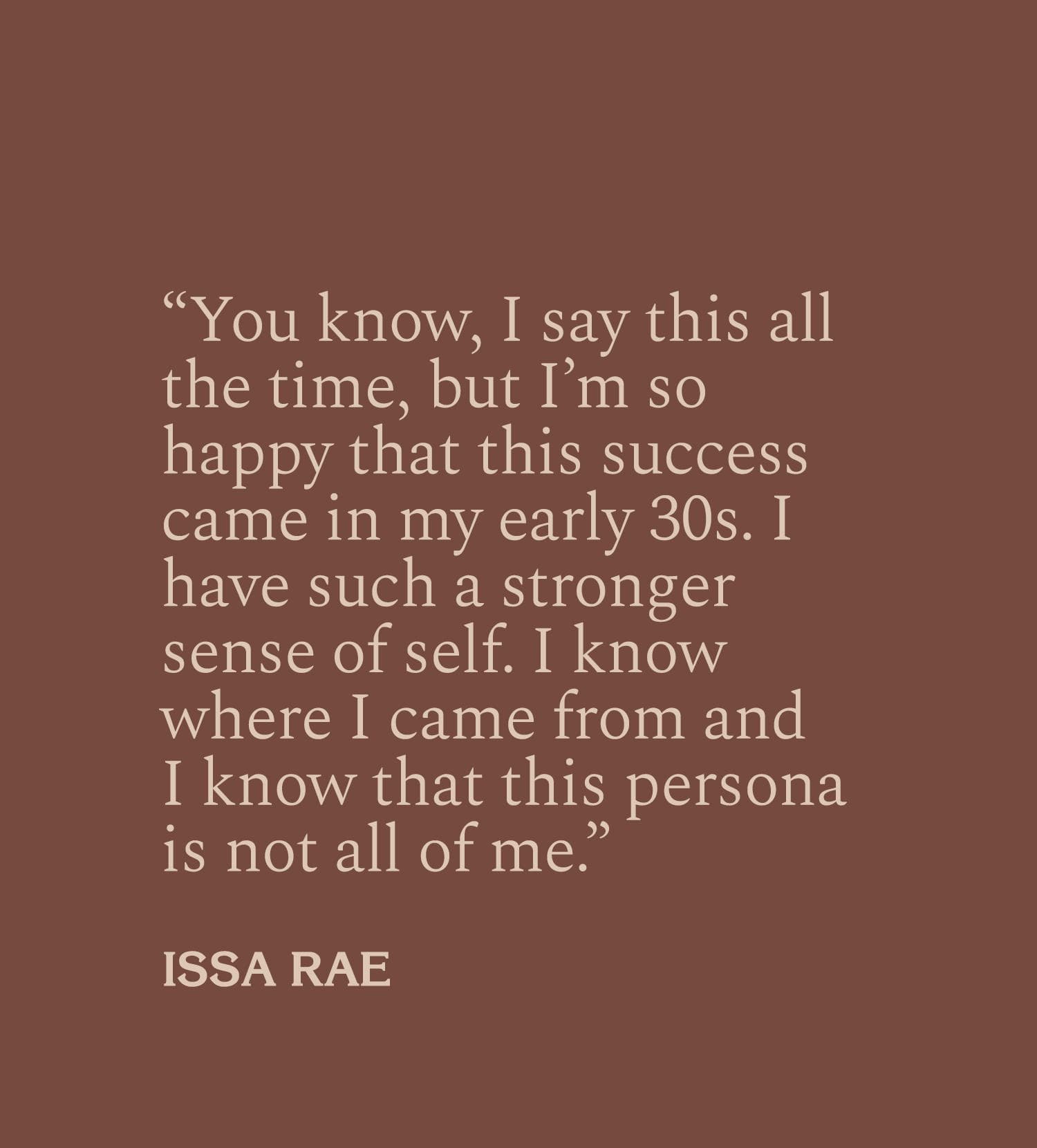 "I always had this thing where I felt behind and [waking up early] makes me feel like I have a handle on my day. I'm able to exercise and reflect, and it just makes me more optimistic about the day, it's really refreshing." The early morning wake up time, the daily exercising, her journaling habits, it all helps Issa carve out the time one needs to gain a sense of introspection that's necessary to creating art. "You know, I say this all the time, but I'm so happy that this success came in my early 30s," she says. "I have such a stronger sense of self. I know where I came from and I know that this persona is not all of me."