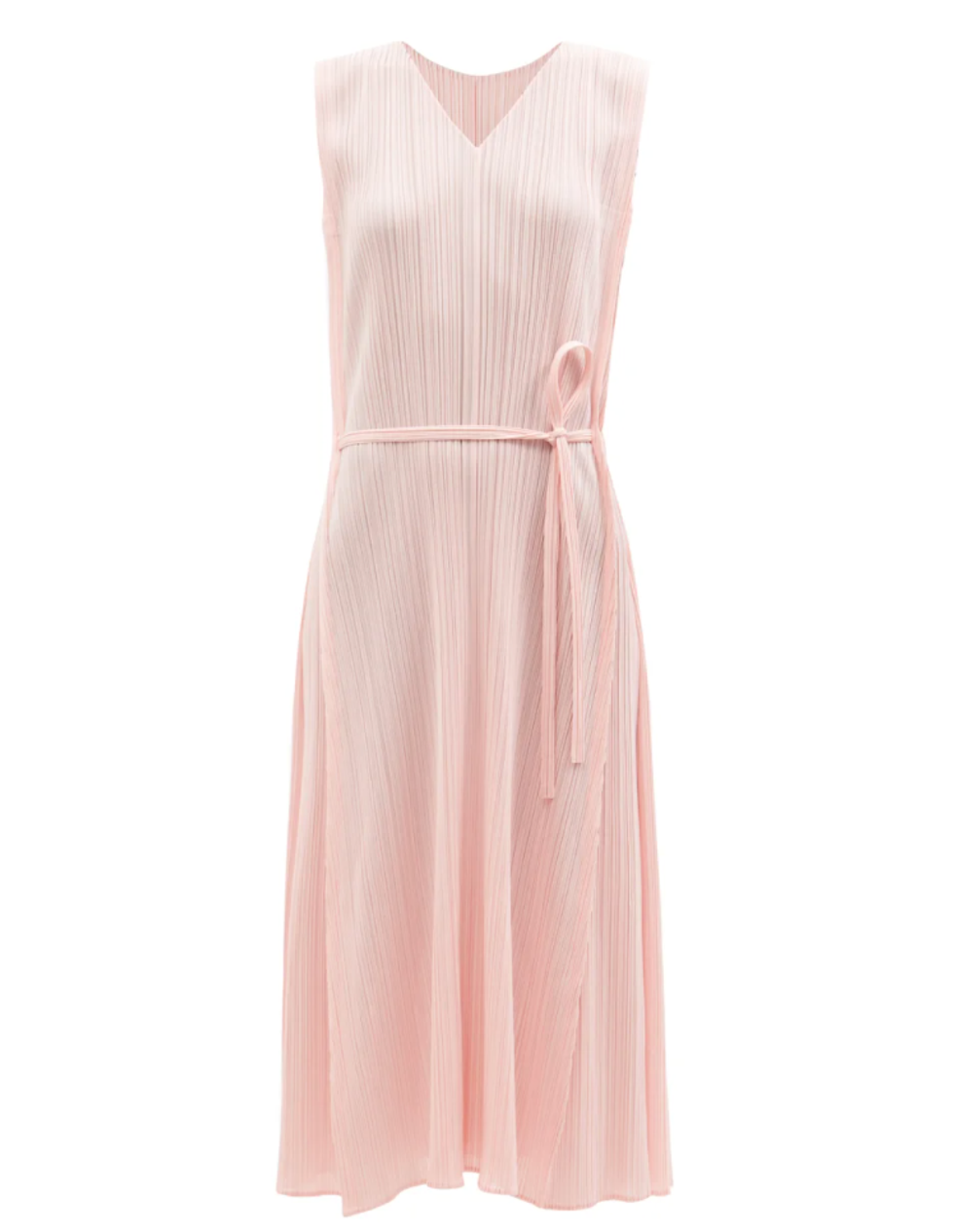 According to the Issey Miyake website, each plissé piece is "made with a unique garment-pleating technique where the materials are developed from a single thread and pleats are added after sewing the clothes into shape." Though described as pleated, the texture is more akin to a sort of crinkled effect that adheres to an array of body types—and will adapt if your own size happens to fluctuate. The line is characterized by the consistent fabric though the silhouettes and hues of dresses and separates vary only slightly over the years.