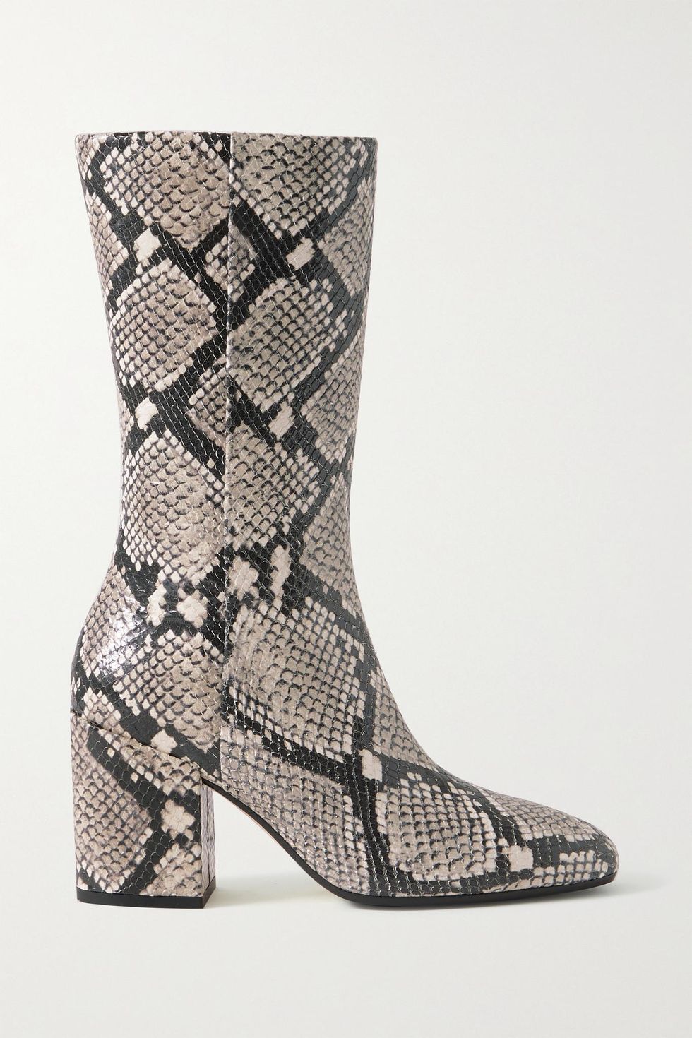 Transitional weather provides a narrow window in which to wear both a mini hemline and a long-sleeve top. Jazz up the neutral look (and keep those feet warm) with a pair of snake-print boots.