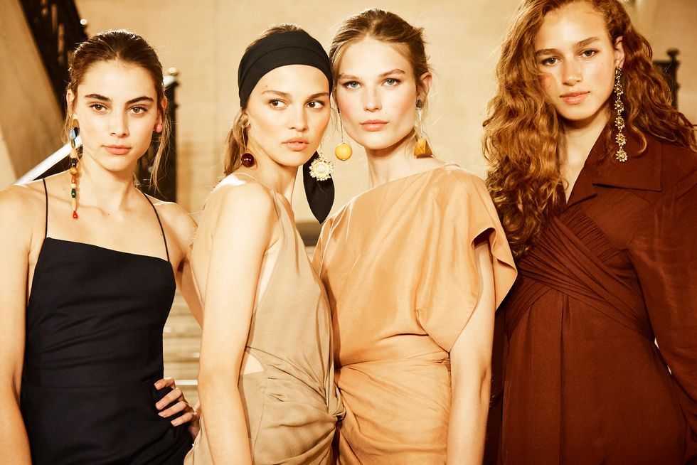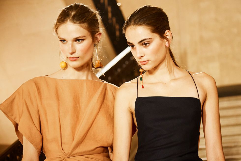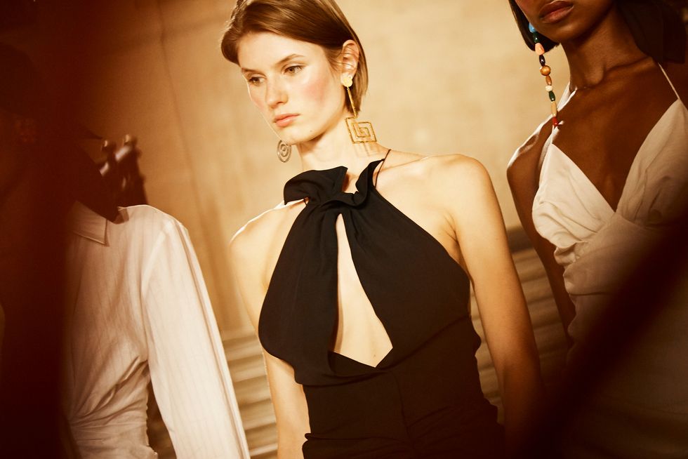 Models walked down the runway wearing mismatched ceramic earrings, mules with geometric heels, sarongs tied nonchalantly around their hips, and wide headbands. They were glowing as they walked to an upbeat soundtrack that included Gloria Estefan’s Conga in teeny mini-dresses, midi-slip dresses with one strap sliding off the shoulder, and various iterations of the ruched white shirt dress. There was a casual sensuality about the opaque lurex slip dresses, black pants cropped above the ankle, and beautifully draped tops that were twisted and tied. Swimwear, a staple at the beach, was reimagined as dresses with voluminous skirts reminiscent of sarongs.