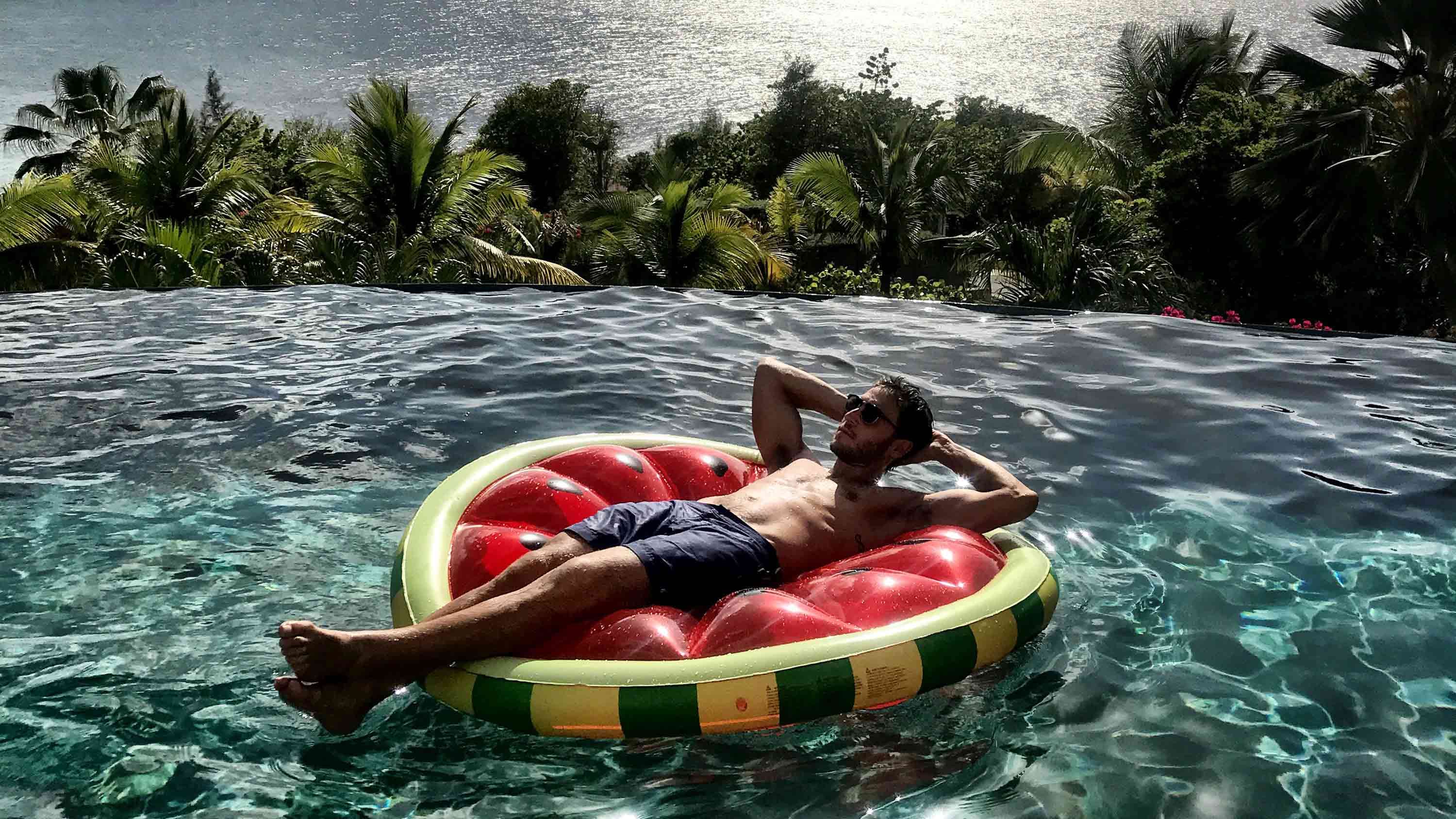 Most recently, the day after returning from a nine-day trip to Koh Samui, Jake packed up a few white linen shirts (because island life), his usual go-to white and black t-shirts and a few pairs of sandals and loafers into his TUMI 19 Degree luggage and headed to the magical island of Saint Barthélemy (St. Barths for short). “I travel all of the time, and this flight is always something I’m excited for,” he said of the flight over. “I always know it’s going to be a little bit insane because it’s a small 10-passenger plane.” For the next seven days, Jake hopped around the island shooting content for the site (stay tuned!), visiting multiple beaches and trying out the local cuisine—word is that the local Mahi Mahi is a must-try if you ever go.