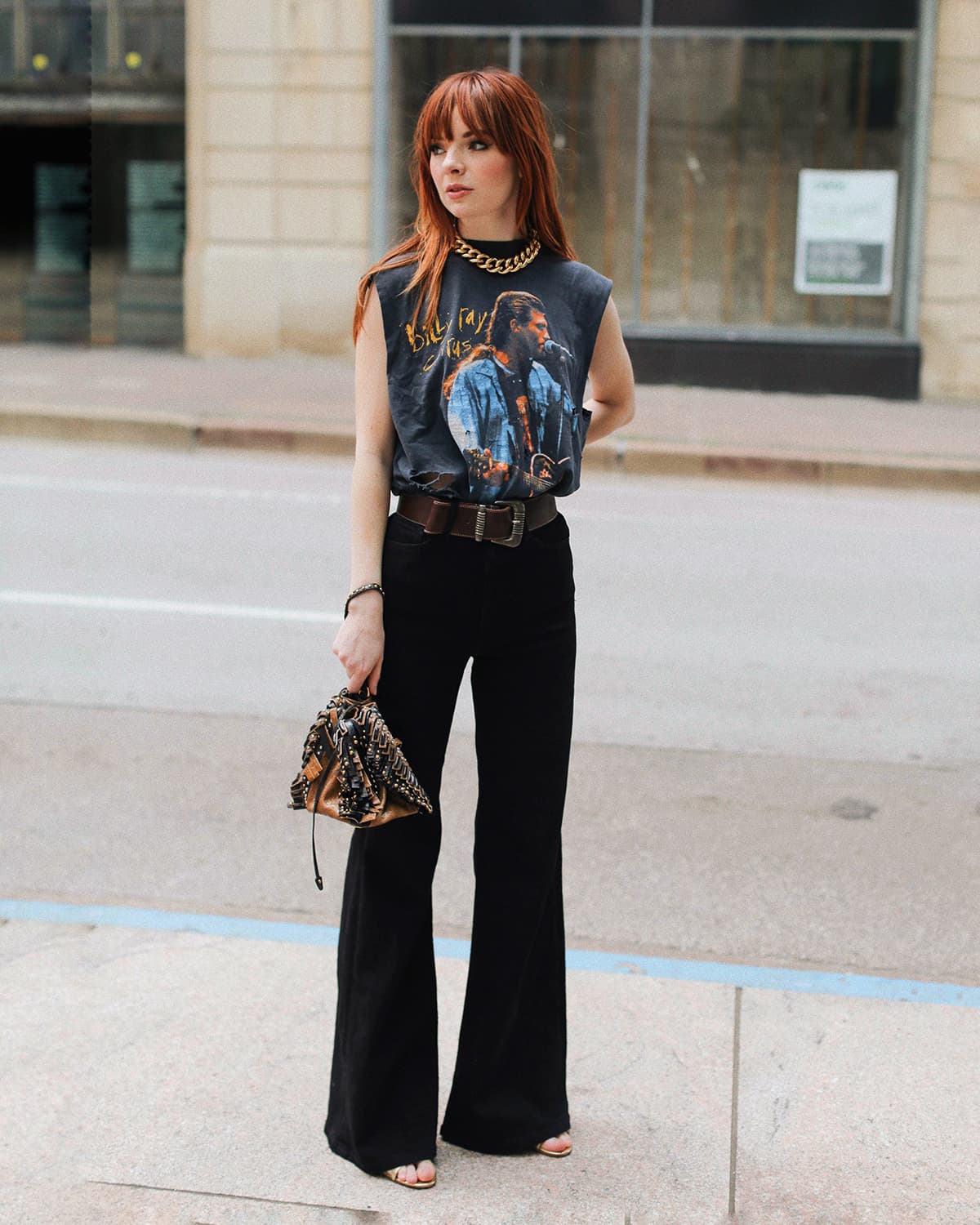 “I am not very fashionable for everyday duties. It’s always grey jeans or leather pants, battered Western boots, men’s shirts, and shrunken or oversize blazers—very 2007. I try to punch it up with good belts. If I have to dress up and I don’t know what to wear, I always wear a big taffeta skirt (I have several colors) with a sweatshirt or sweater tucked in and really fun heels. It never fails and makes a nice, simple base for accessorizing with cute belts and bags.”