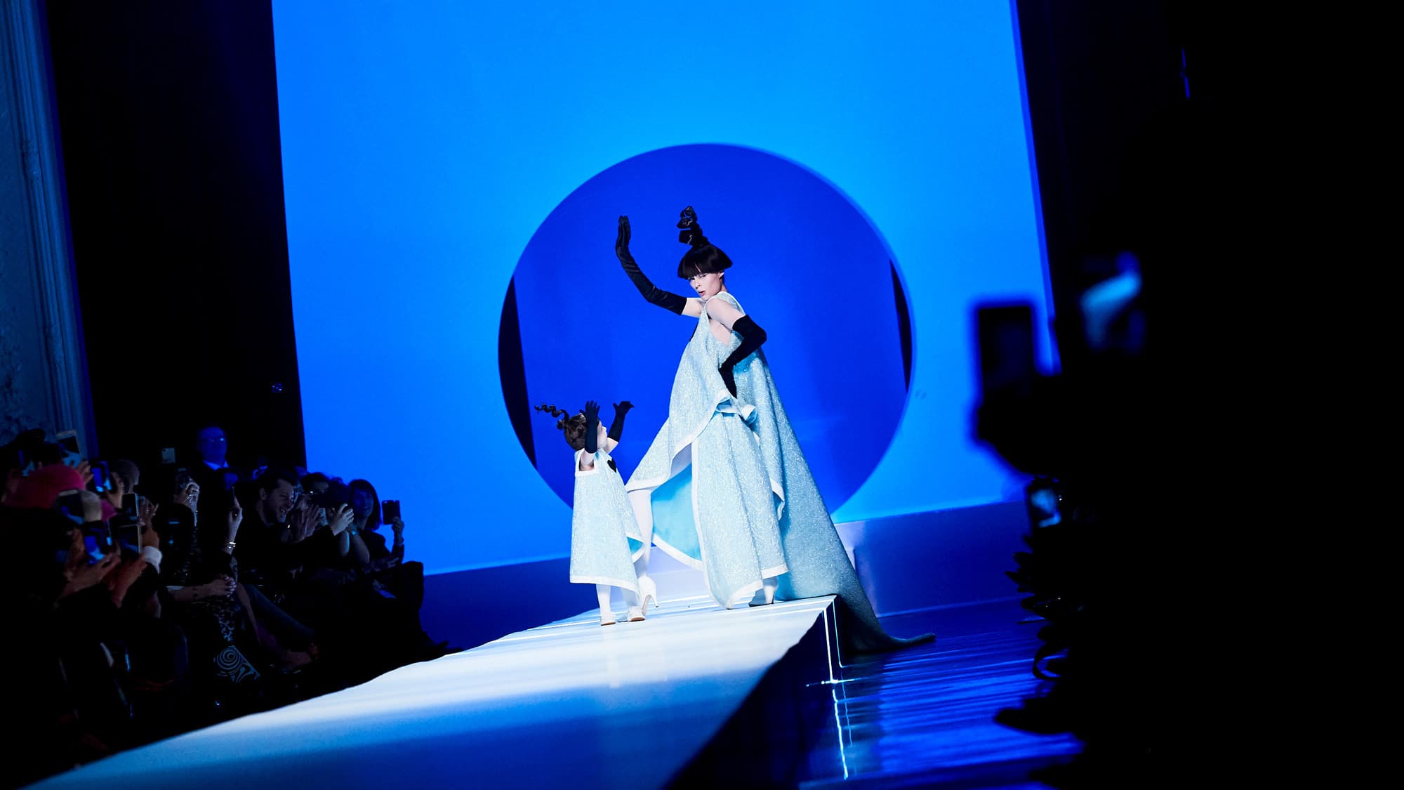 Coco Rochas, who is a veteran of the Gaultier runway, modeled one of the final looks with her daughter, Ioni, in matching ice blue dresses. The adorable two-year-old copied her mother’s poses as they walked down the catwalk hand in hand.