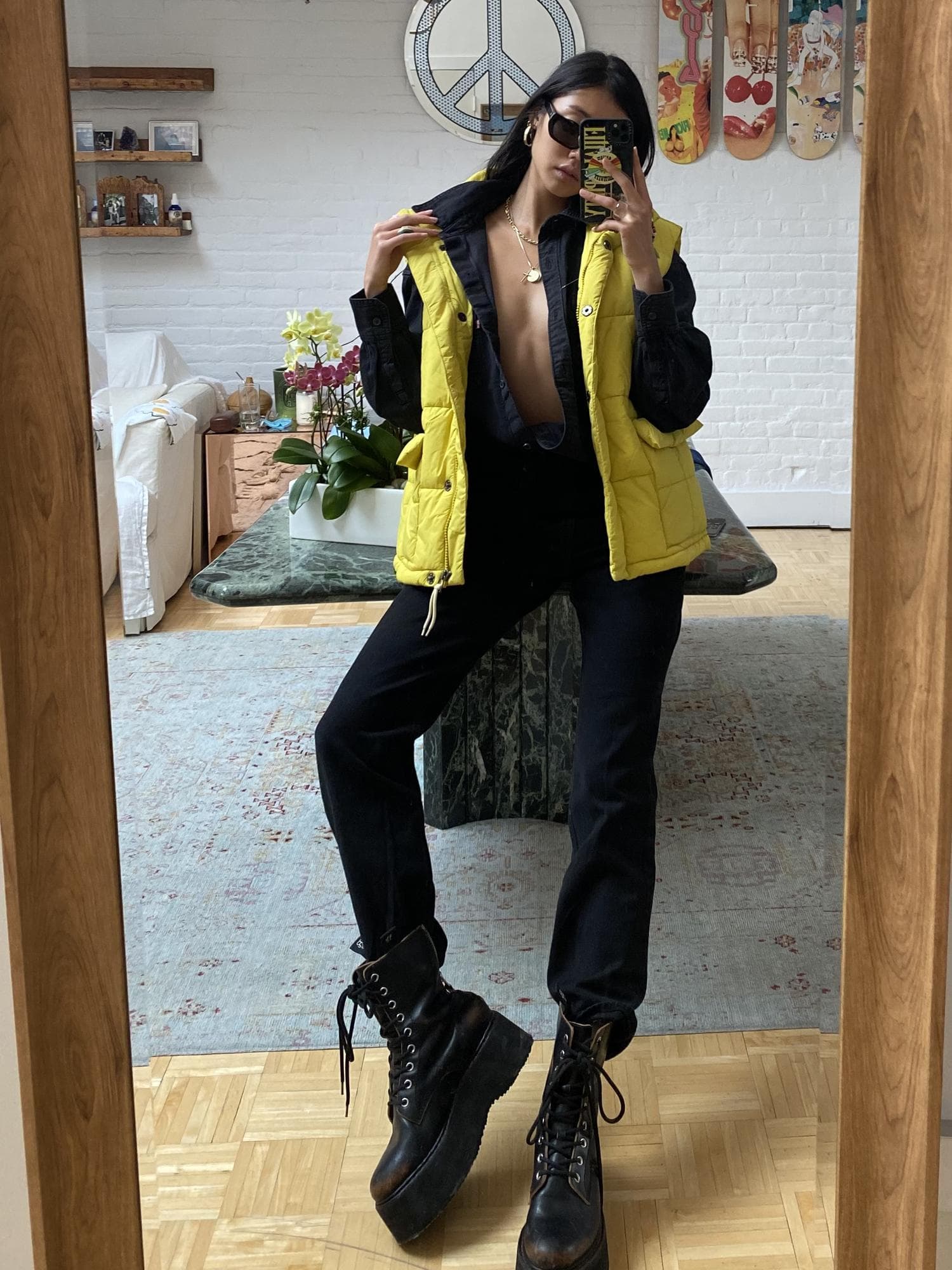 "As a multi-hyphenate creator, activist, and model, I never know where my days are going to take me: running from last-minute castings to meetings to protests. It's always essential for me to feel comfortable for a full day of unknown adventure. Denim signifies versatility. It can be worn so casually yet, when styled differently, it can be made to feel formal. I love a black jean for that reason—it's so easy to take from day to night, especially with a pop of vibrant color such as the yellow puffer vest. This is the perfect outfit for wearing from day to night for a fall day around the city."