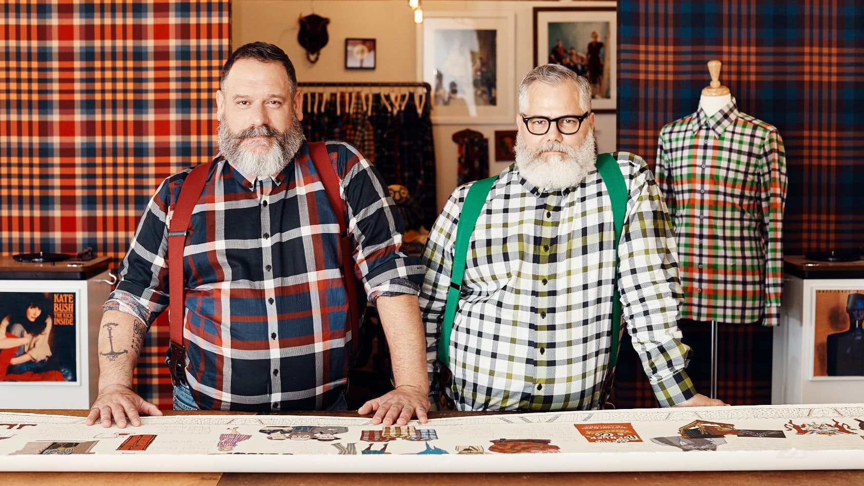 Their newest collection draws inspiration from another mutual love—literature. Stacks of books, including several first editions, line the office walls, and their corresponding fabric swatches hang on mood boards nearby. They explain that the muted, vintage cover of Sylvia Plath’s The Bell Jar inspired the pattern on Jeffrey’s green plaid shirt. And Robert’s? “Cocteau Twins Blue Bell Knoll.” An album, naturally, to commemorate their years on the road.
