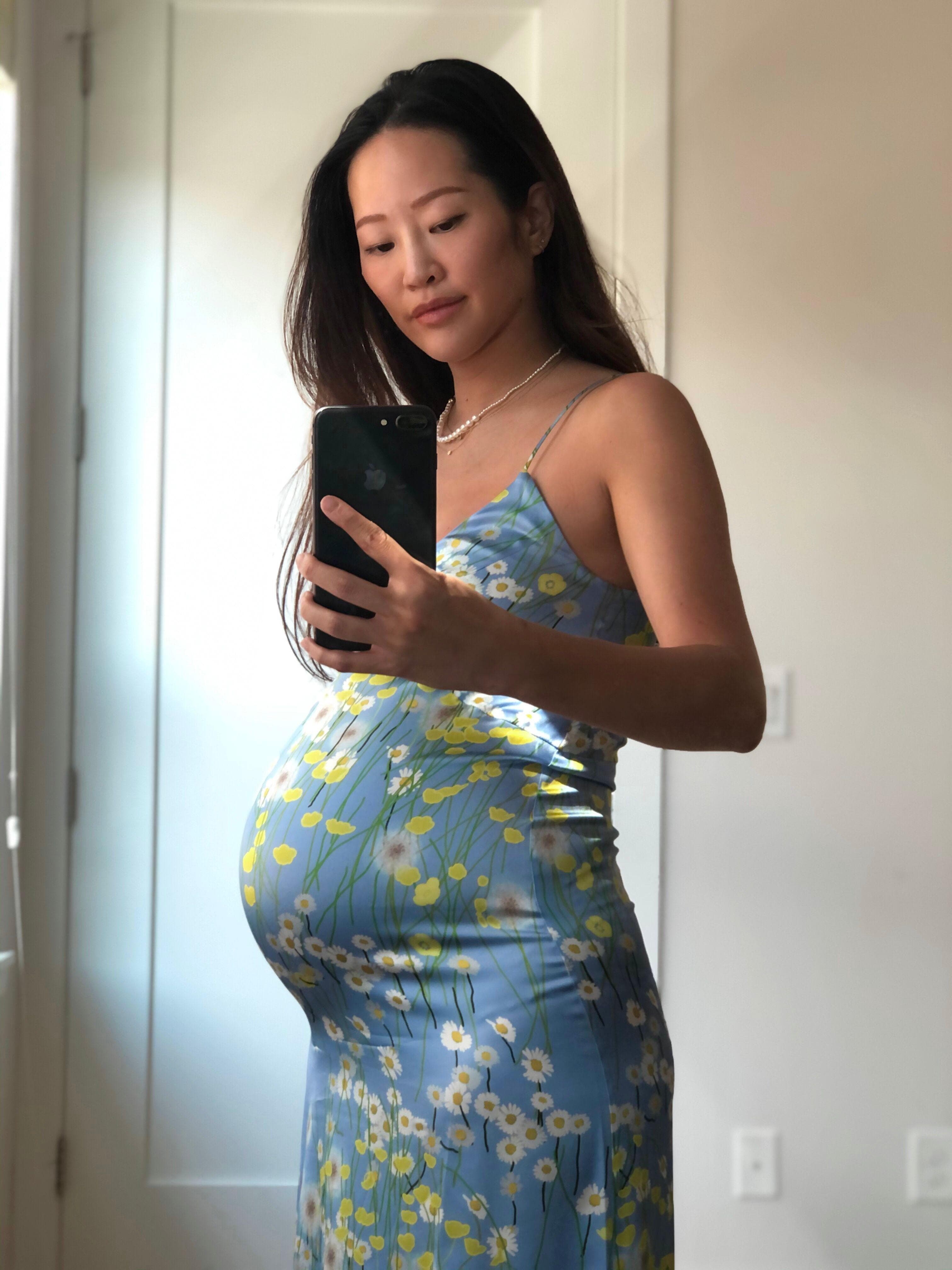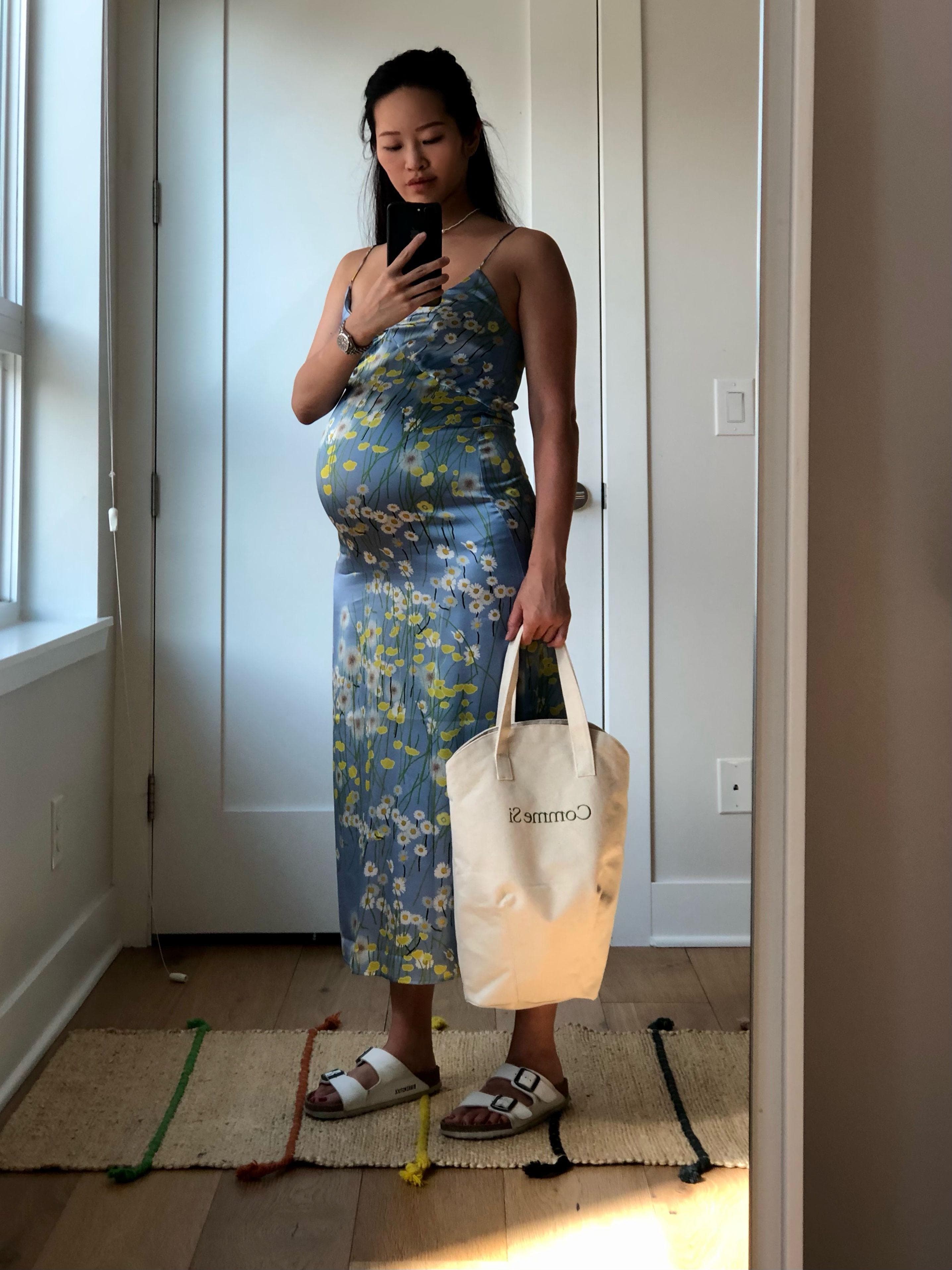 Photo: Courtesy of Jenni Lee"Venturing out to the market to buy flowers for my office. You can't go wrong with an easy slip dress. Silk slips are my go-to normally and also during pregnancy. They're effortless, flattering, and silk adds a touch of something special, even when worn casually."