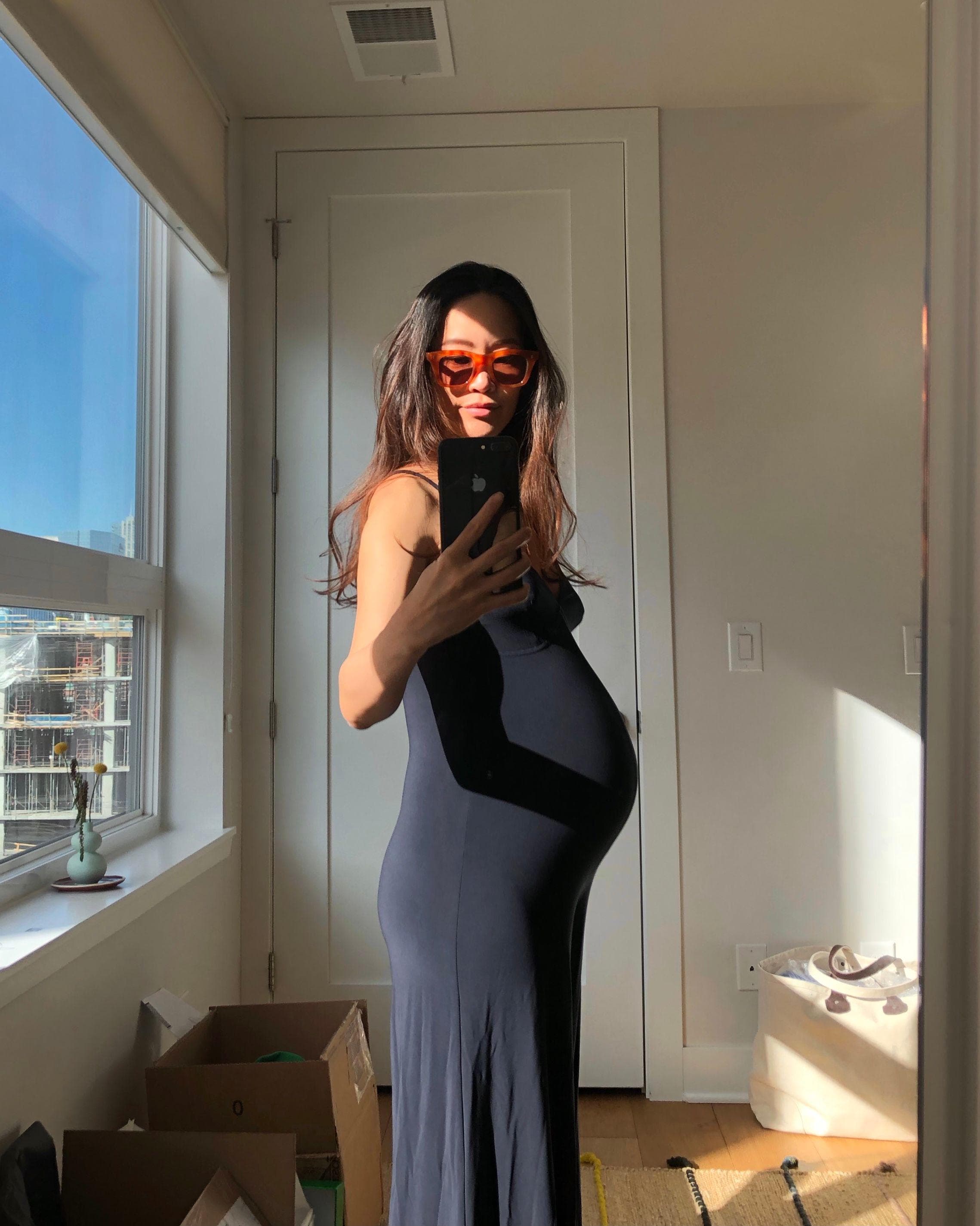 "I would describe my style as classic with a twist. I generally prefer to buy clothing in shapes and silhouettes that I know suit me well, in materials that are comfortable and versatile. I get a little more experimental and have fun with accessories like sunglasses, socks, shoes, bags, and jewelry. During my second and third trimesters, my outfit formula has been to find pieces that stretch in silhouettes that can be worn post-pregnancy, as well. I've found that jumpsuits, slip dresses, and jersey dresses are the best options."