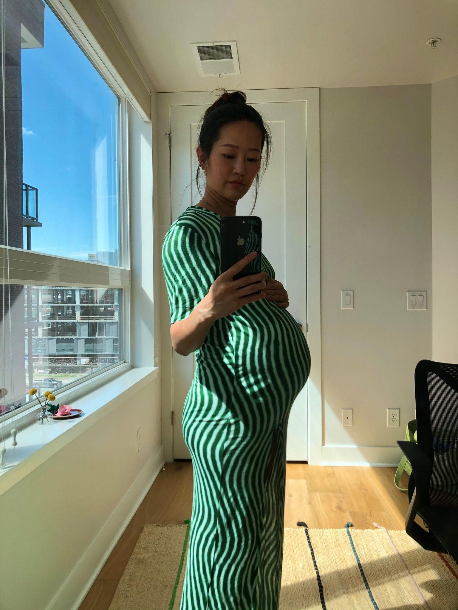 Photo: Courtesy of Jenni Lee"I was curious to see how this dress would fit over my belly. It's made from an extra-soft cotton jersey, so it's very comfortable to wear, but the funky pattern makes it feel less casual. It's an easy dress to throw on for date night—we're trying to savor those before baby arrives."