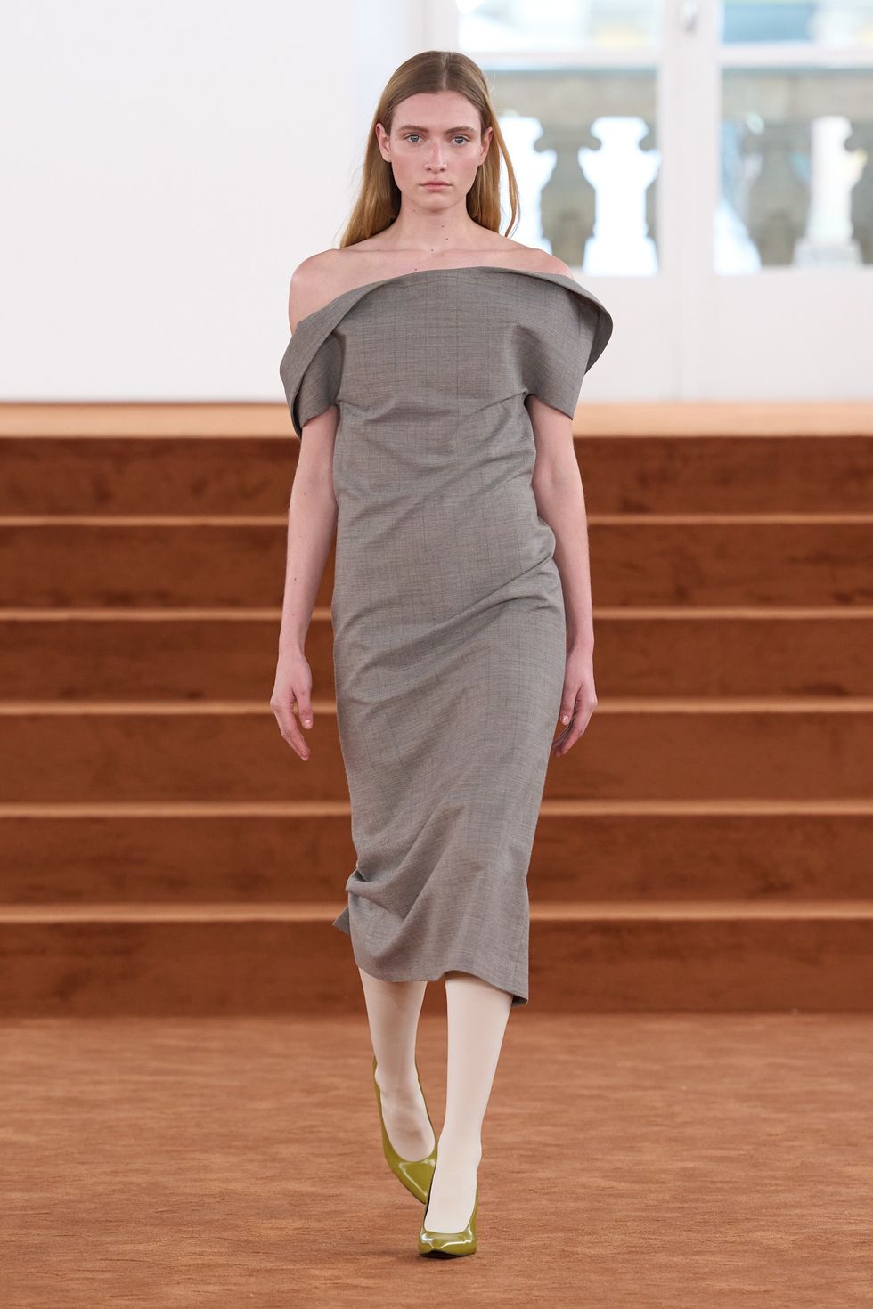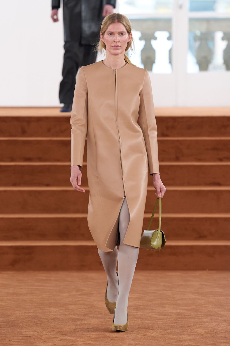 Hair was worn loose or vaguely tied at the nape of the neck, asymmetry was given away at the collar, a skirt cleverly draped off the hip; all indicators of minimalism done well, which is to say, minimalism done excitingly. There were flesh-toned leather coats with grey tights and east-west leather bags the color of tinned green olives. The flash of a cobalt blue sock intercepts monochromatic brown, grey, and black looks, while elsewhere Bellotti floats the idea of a lilac high-necked shirt peeking from under a sandy coat, or a mint green purse.