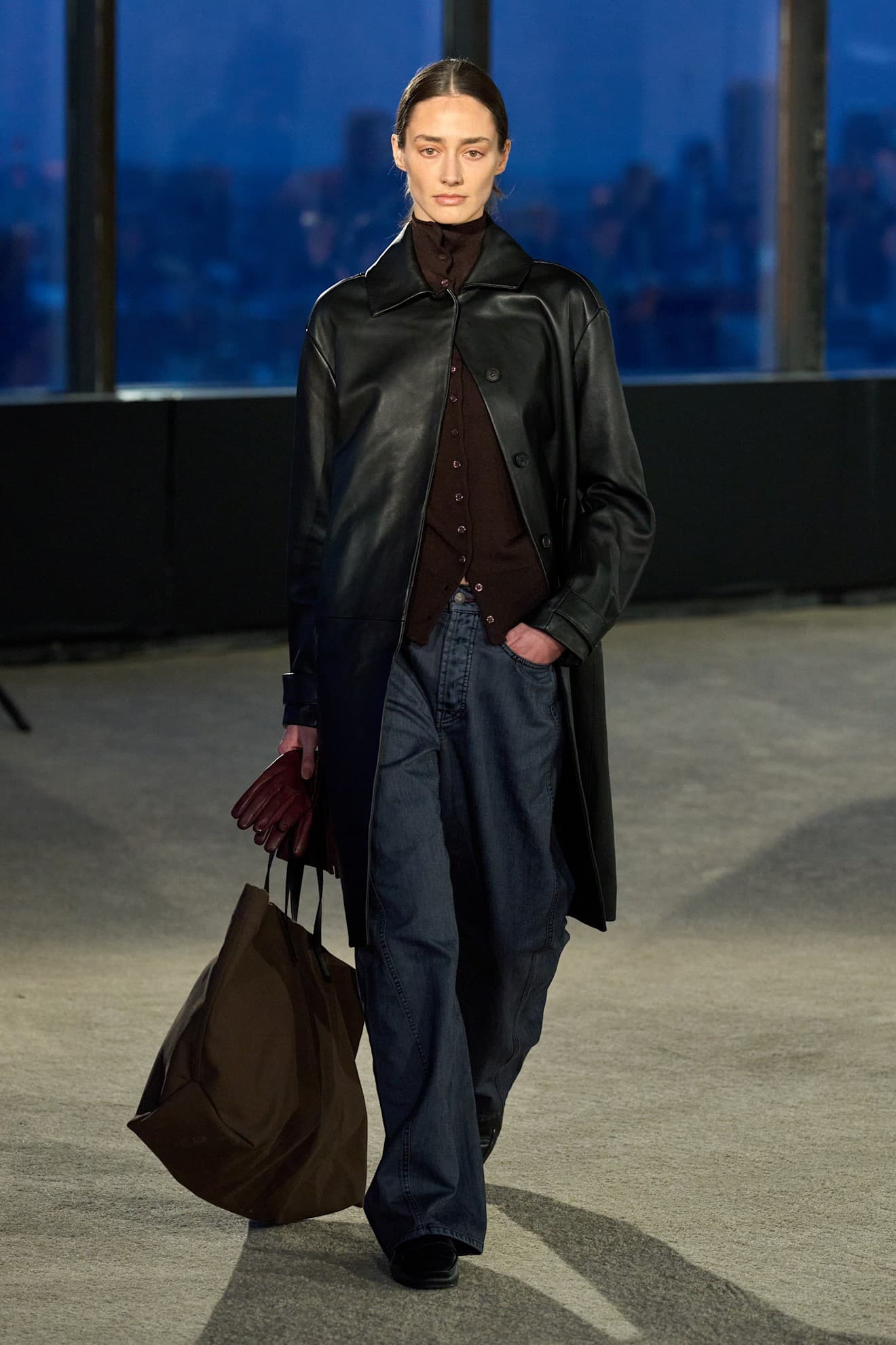 LaunchmetricsUnderscoring these magpie-like touches, are simply beautiful pieces of clothing. A draped butter yellow silk dress emerges first, followed by a neat black suit which is layered over a watery shirt of the same silk. A series of funnel neck trench coats are seen in classic black and camel, while other wardrobe staples—a pair of perfectly washed blue jeans, a black dinner dress, a leather trench coat, fortify the foundations of what feels like the grounding force of the Kallmeyer code.