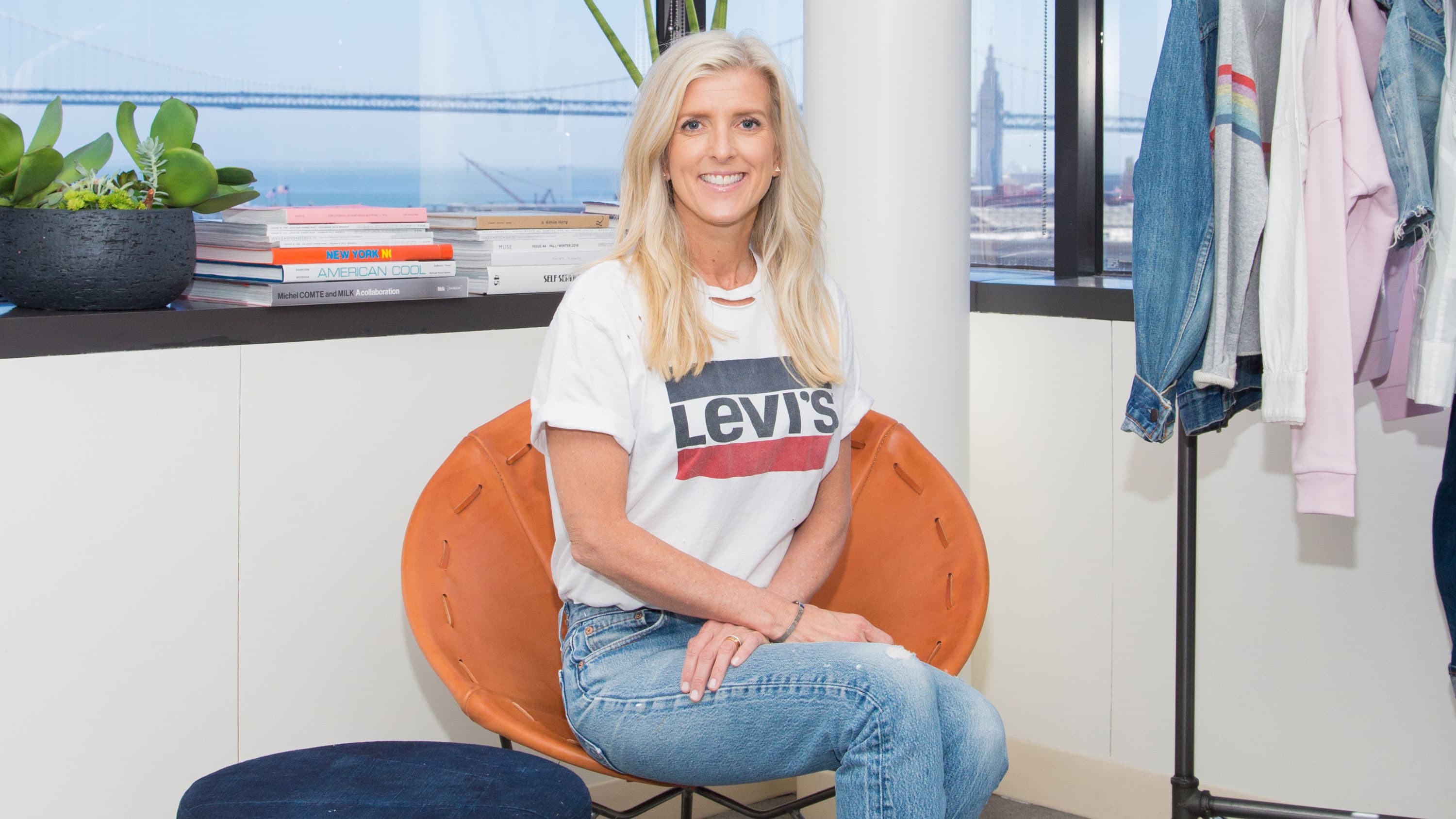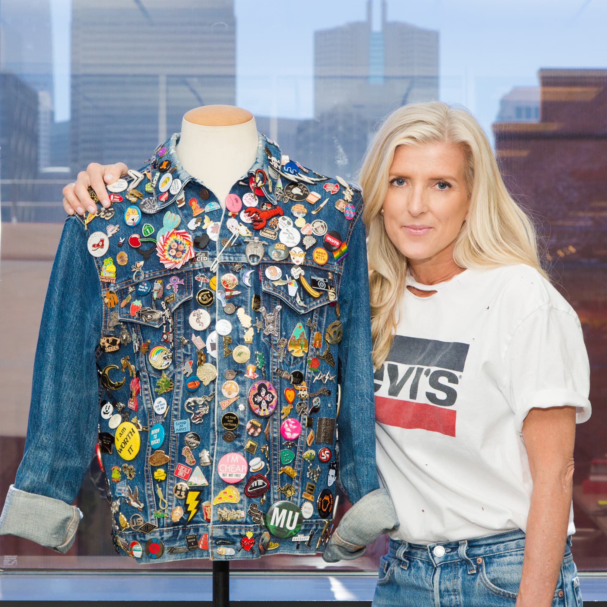 As a true fashion industry veteran, she’s got quite an impressive résumé, with stints at both Calvin Klein and Gap over her 25 years in the business. Since joining the Levi’s team in 2013, she’s helped redefine denim’s on-trend silhouette as well as maintain the cult-classic shapes we all know and love. It doesn’t hurt that she’s also a die-hard denim-phile—she’s rarely seen not wearing a perfect pair of jeans. The day of our shoot at Levi’s San Francisco headquarters, Hillman was wearing one of her favorite styles—the 501—and showed us the most *epic* Trucker jacket we’ve ever seen. Clearly, she knows how to curate a pin collection, and there’s no one better to guide us through everything the historic brand is working on currently and in the months to come. (Hint: If you like customizing and reworking old denim, you’re in for a treat!)