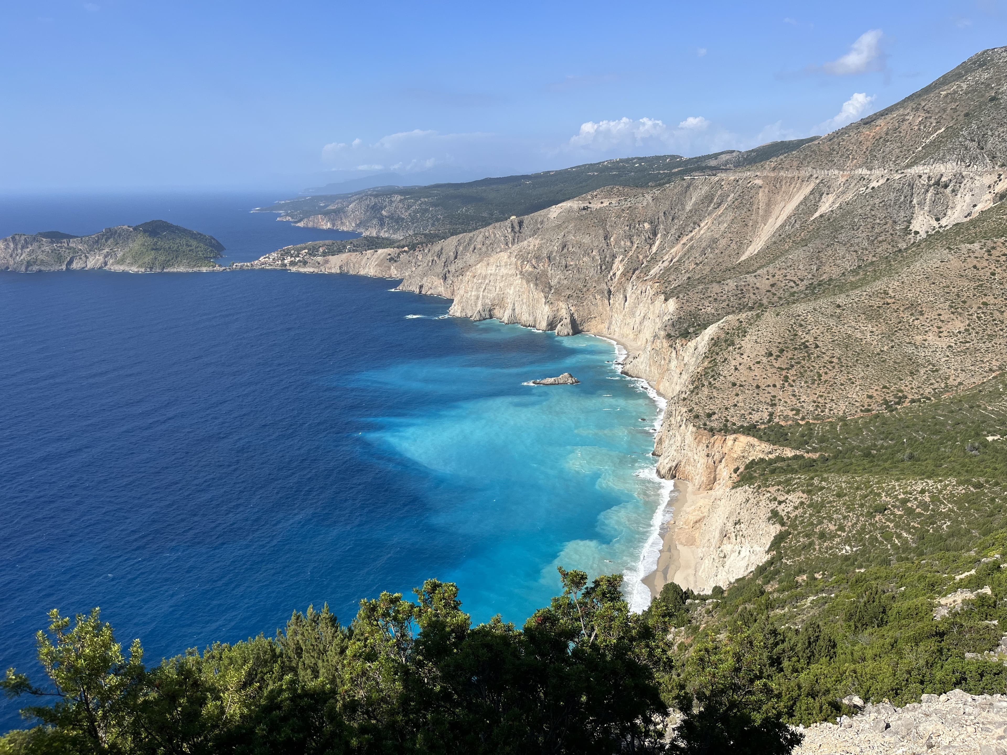 There is one main airport on Kefalonia (EFL)—I flew here with my fiancé on an affordable Aegean Airways flight booked via the delightfully easy-to-use travel app Omio and we rented a car from the airport. If possible, opt for a smaller car model to help when the roads narrow and the parking is limited. While it’s technically feasible to visit Kefalonia sans vehicle, I wouldn’t recommend it—this is prime road trip country. And even when the roads are winding along a steep cliff (this happens a lot), I found them to be wide enough and often protected with a guard rail, which will acquiesce even the most timid of drivers.