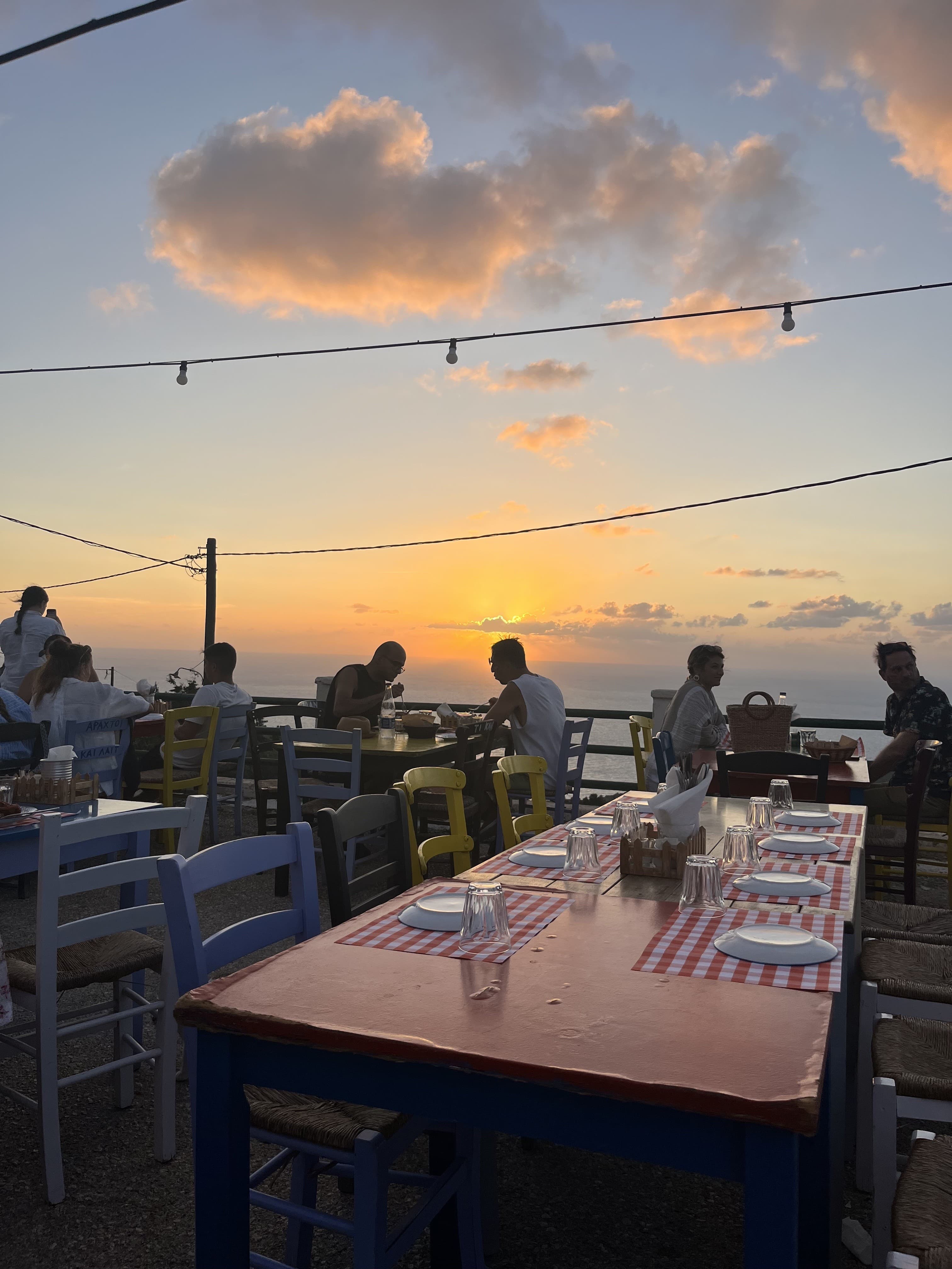 Ladokolla Stin Plagia: Those in search of a locals vibe should make their way to this lovely taverna with arguably one of the best sunset views on the island. Several colorful chairs and tables with gingham tablecloths are situated across an outdoor open space, accented only with bistro lights and unobstructed views of the ocean. Order the pork knuckle, souvlaki, saganaki, and orange cake.