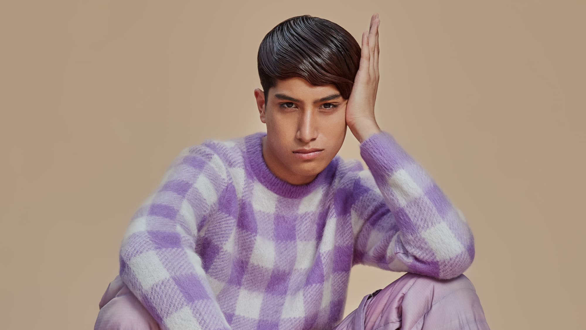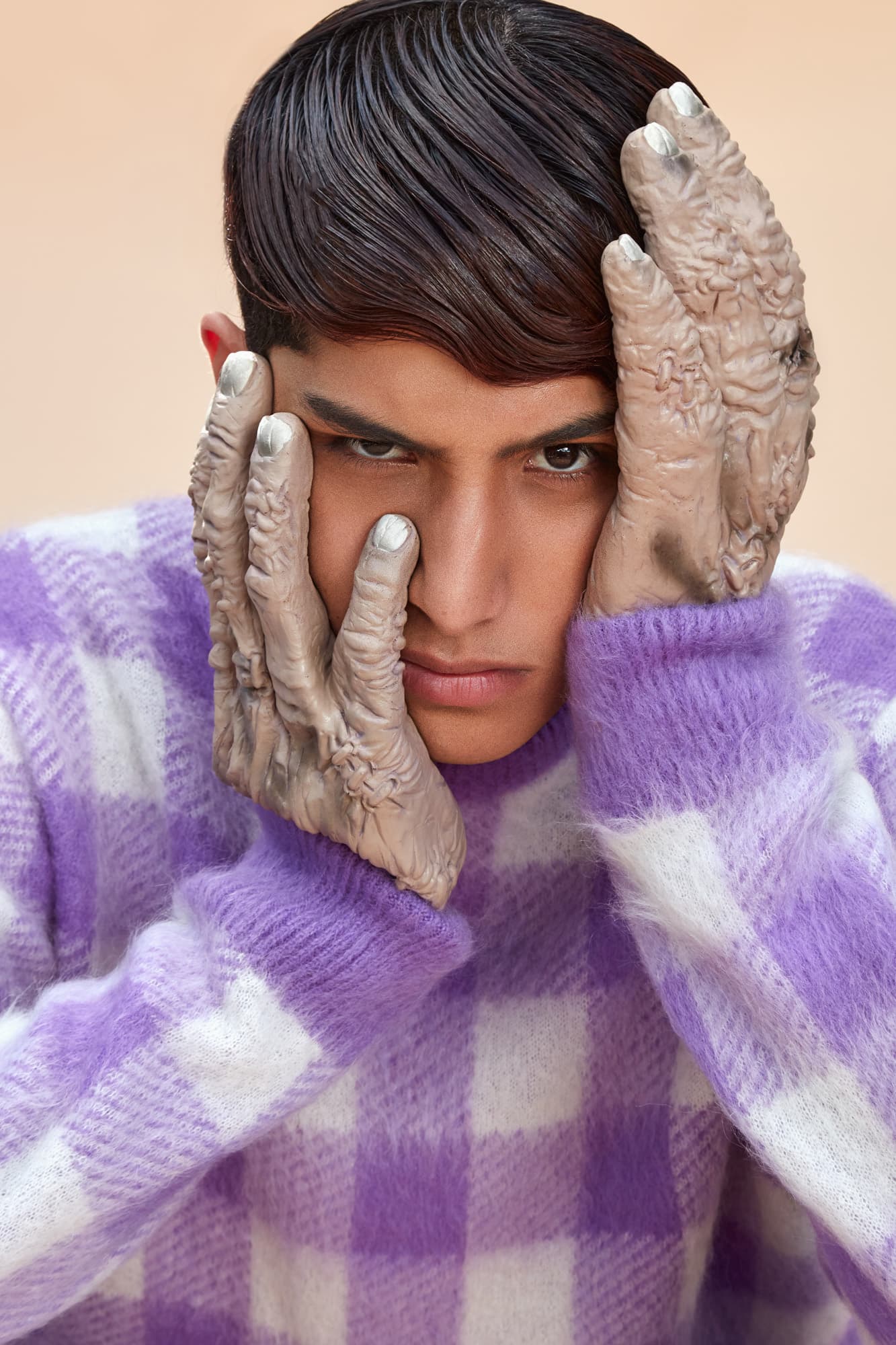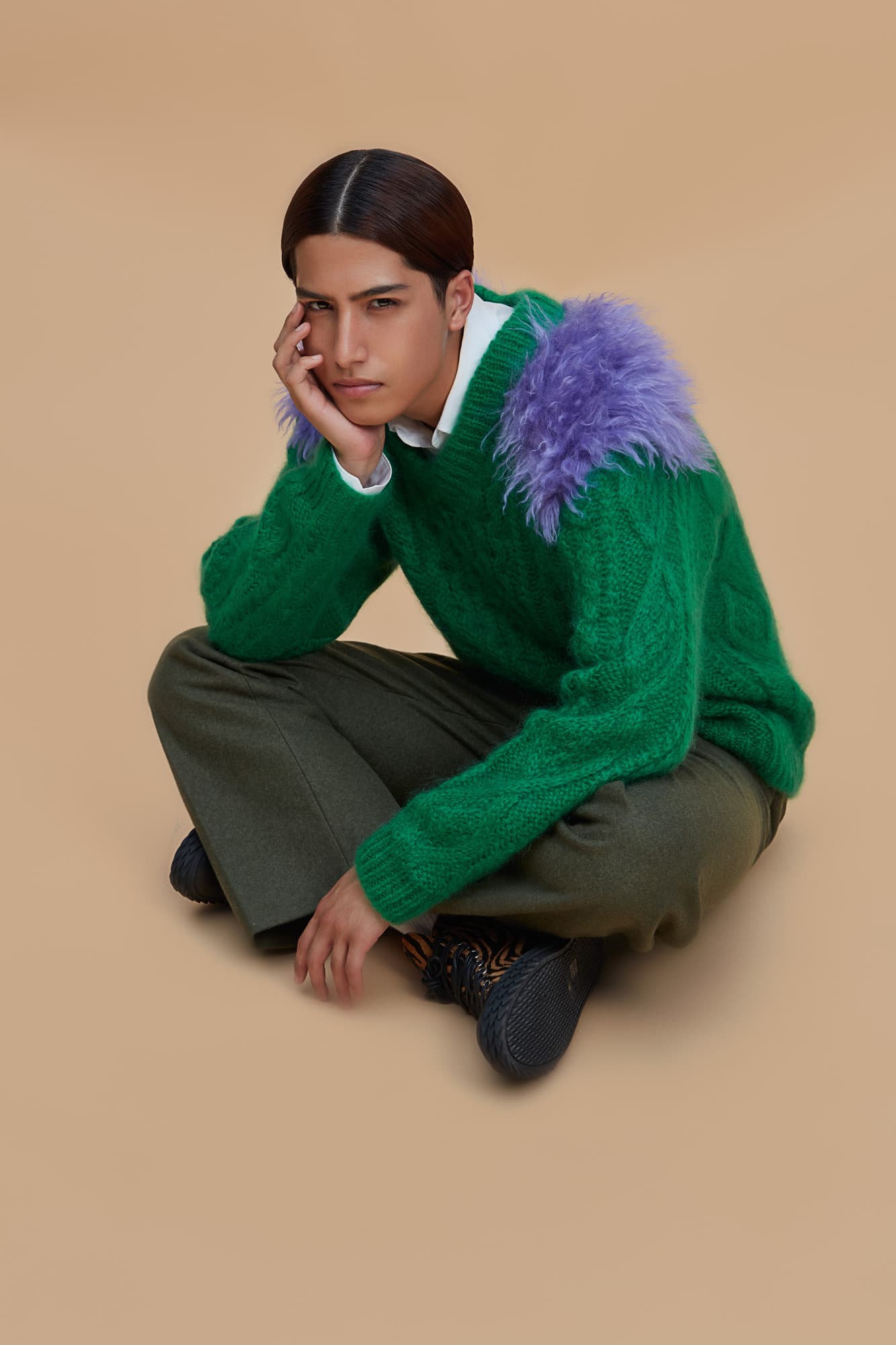 Top photo: Kemio wears a Bally sweater and Off-White pants. Photographer: Grayson Wilder; Stylist: Star Burleigh; Hair: Graham Nation; Makeup: Elizabeth Ulloa; Producer: Social Adam