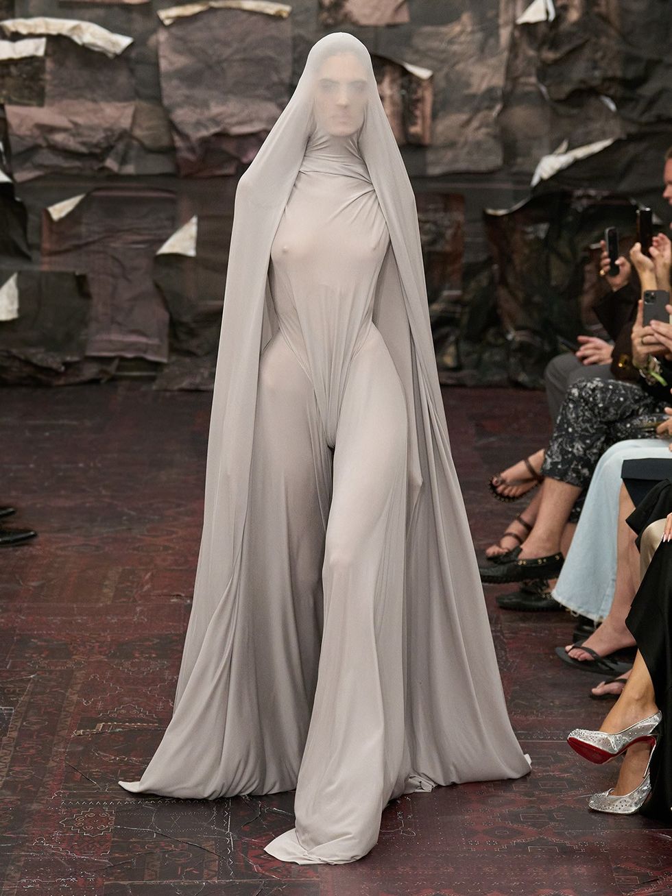The look that Kim Kardashian tapped for the DVF Awards on August 28th in Venice, where she accepted one of five Leadership Awards, is a masterclass in the art of draping. The sheer gray slinky fabric gathers leotard-style, blurring the lines between gown and jumpsuit, while the draping of the high neckline creates a natural, ripply, water-like texture. A cape is seamlessly built-in overtop, creating a dramatic train and a look that moves smoothly and ruches in all the right places with every step that Kim Kardashian takes.