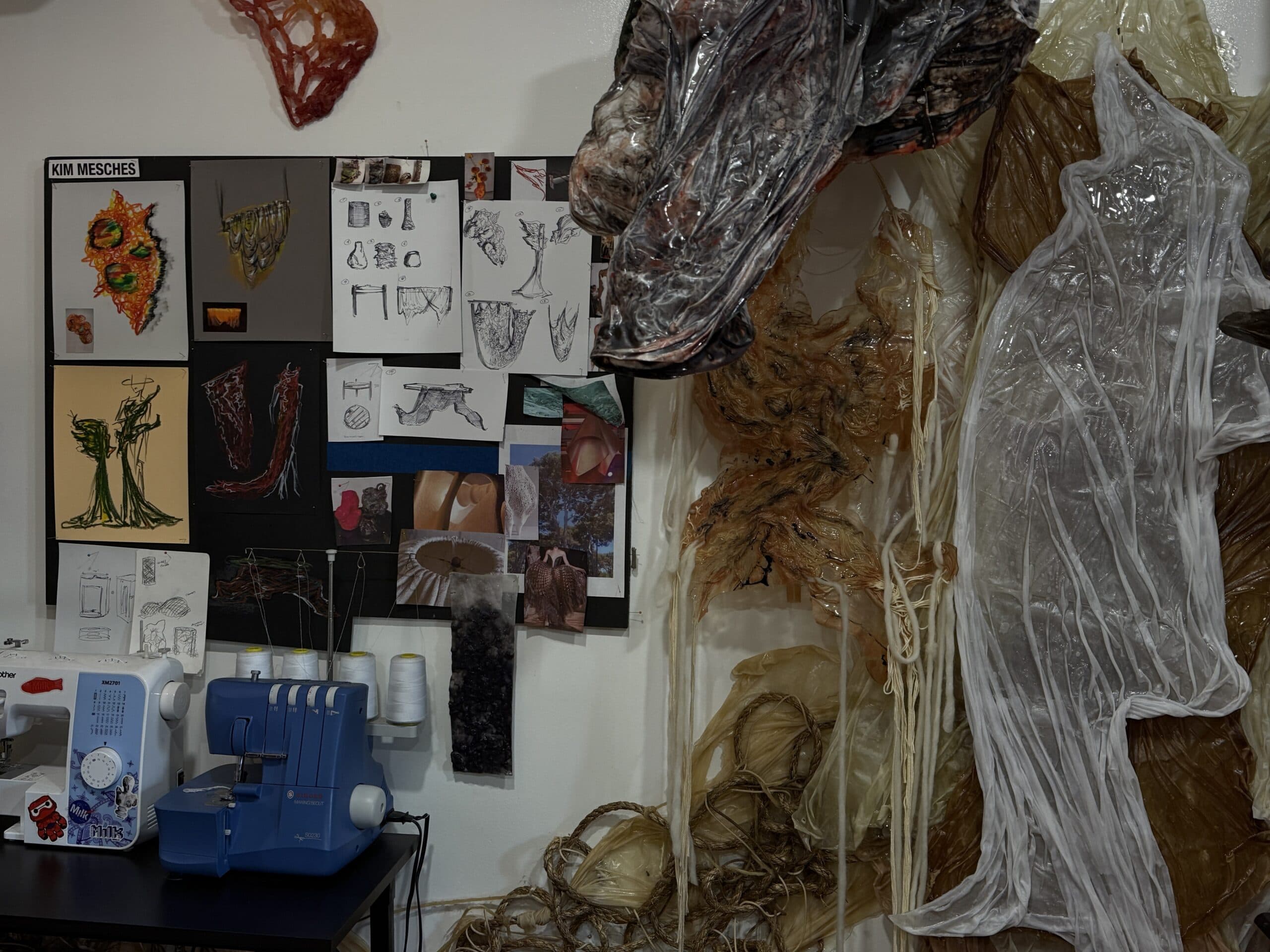 I met Kim Mesches at his Williamsburg home and studio hybrid: a lived-in space filled with light fixtures, garments, and wall art all created by Mesches himself (alongside work by his grandfather, painter and visual artist Arnold Mesches) as well as scraps from old projects patiently waiting to be turned into new ones. This is one of the first things that I noticed about Mesches’s artistry: he is beyond comfortable turning old art into new art. This isn't because he lacks a sense of attachment to his work, but because he is committed to continuously evolving and doesn't beat himself up when something doesn't turn out how he imagined it would. Entering his apartment, one of the first pieces of art that I spot is woven and dyed with coffee. “We experiment out here for the sake of trying shit,” he says. “I love throwing stuff at the wall and seeing what sticks.”